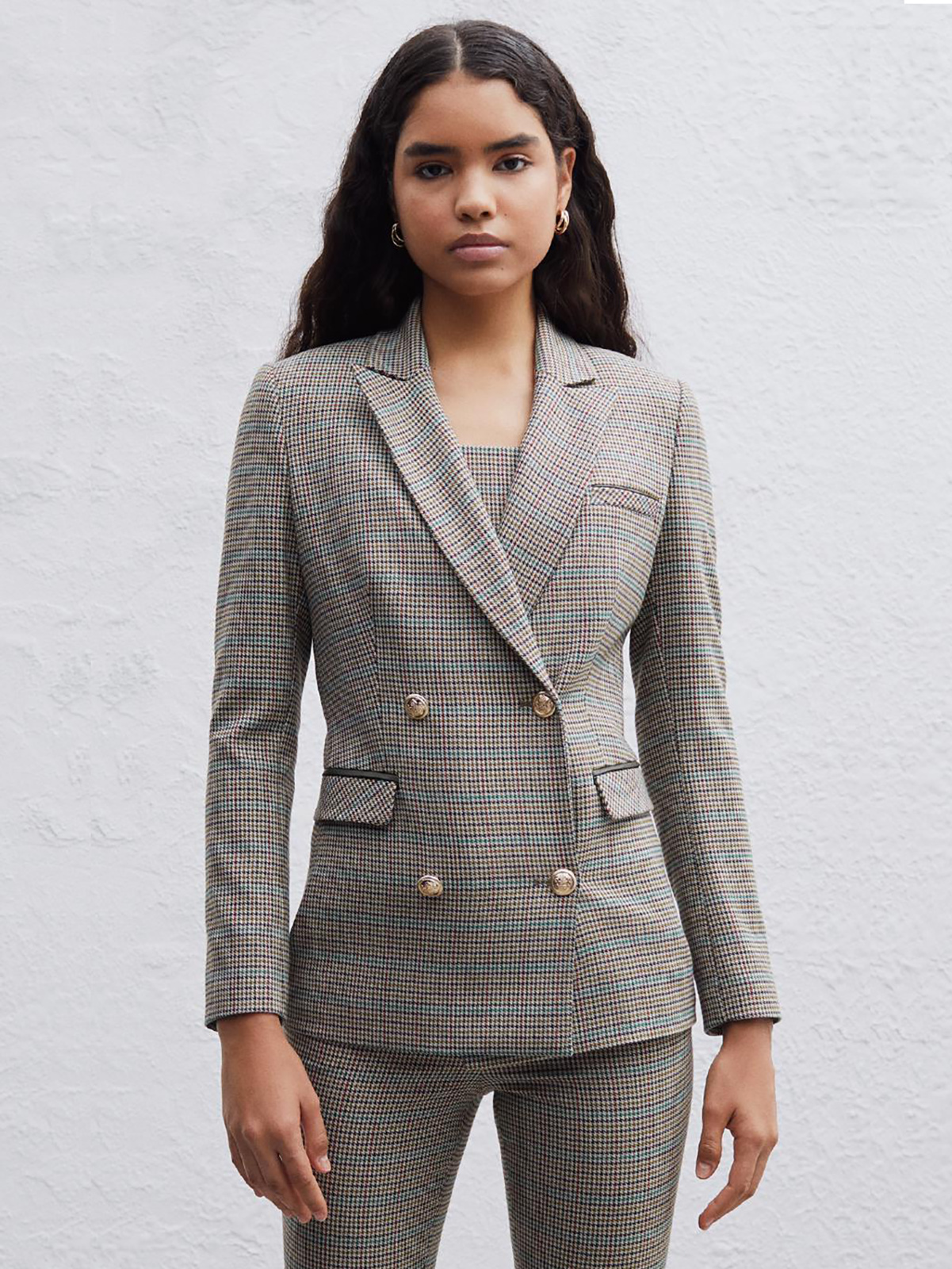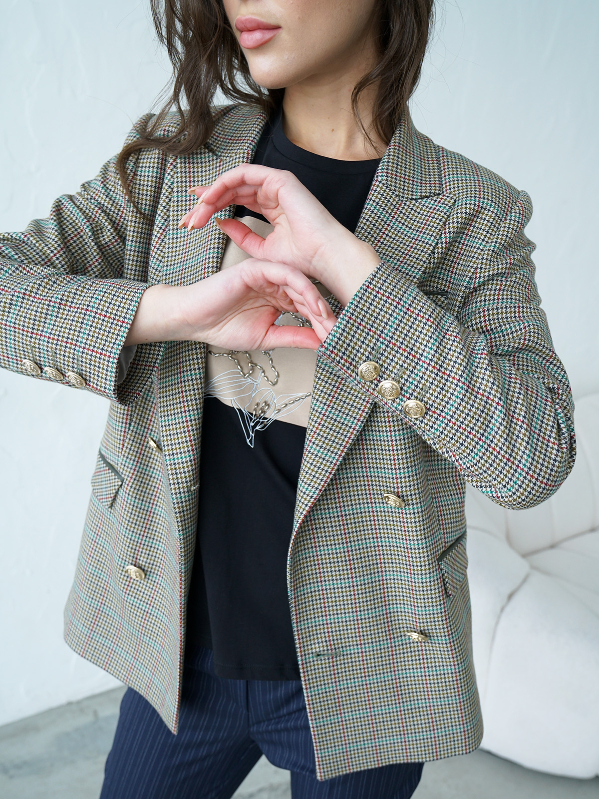 Двубортный жакет в мелкую клетку. Приталенный силуэт, английский воротник с лацканами. Длинный втачной рукав, боковые карманы с клапаном.