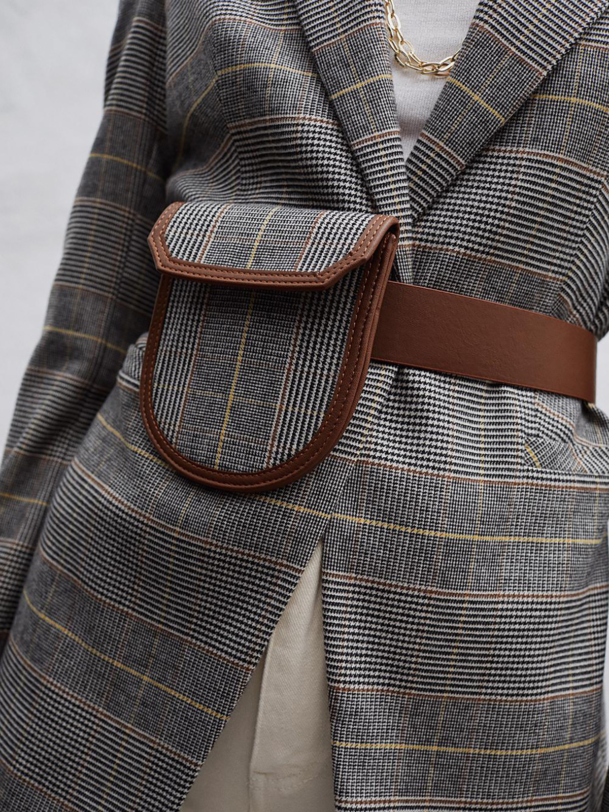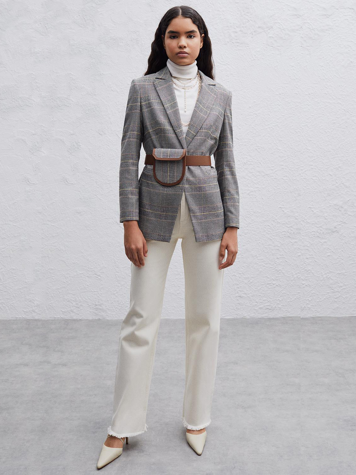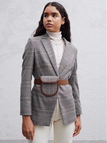 Жакет в мелкую клетку. Приталенный силуэт, английский воротник с лацканами. Длинный втачной рукав, боковые прорезные карманы.
