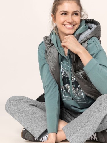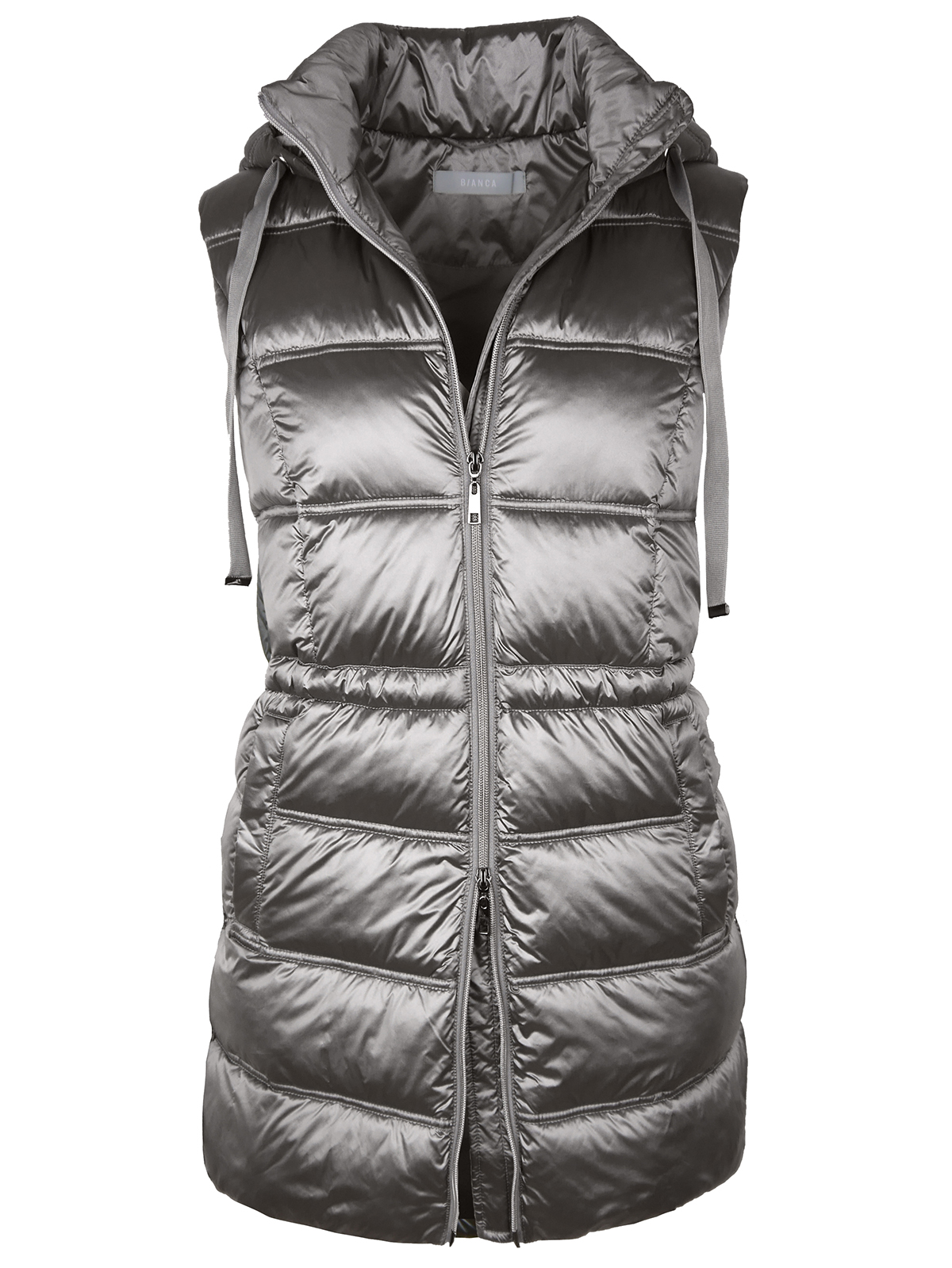 Удлиненный дутый жилет с синтепоновым наполнителем. Объемный капюшон с кулиской. Кулиска на поясе позволяет формировать приталенный силуэт. Застежка на молнию.