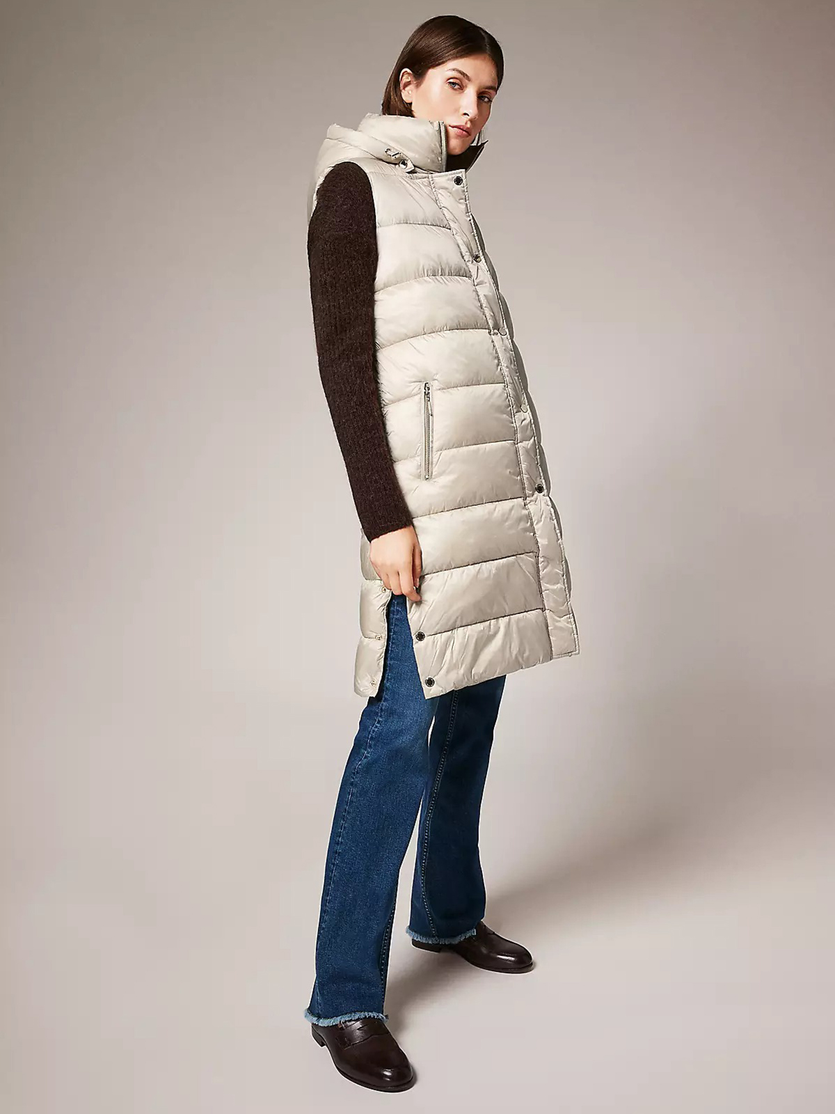 Удлиненный стеганый жилет базового оттенка – теплый и стильный элемент аутфита. Подойдет для образов в спортивном или повседневном стиле, а также для образов спорт-шик. Застежка на молнию и клепки. Объемный капюшон защищает от ветра.