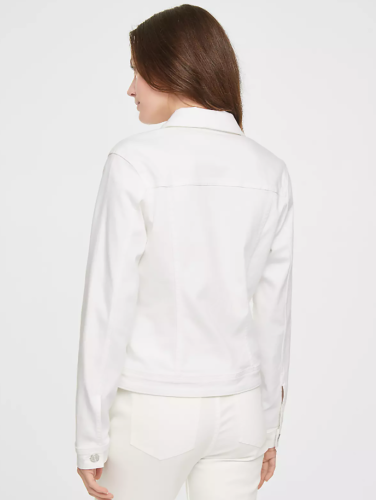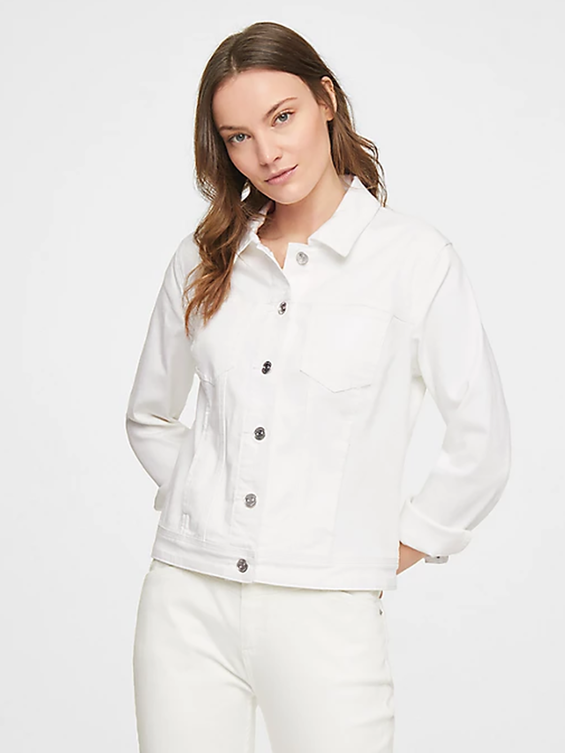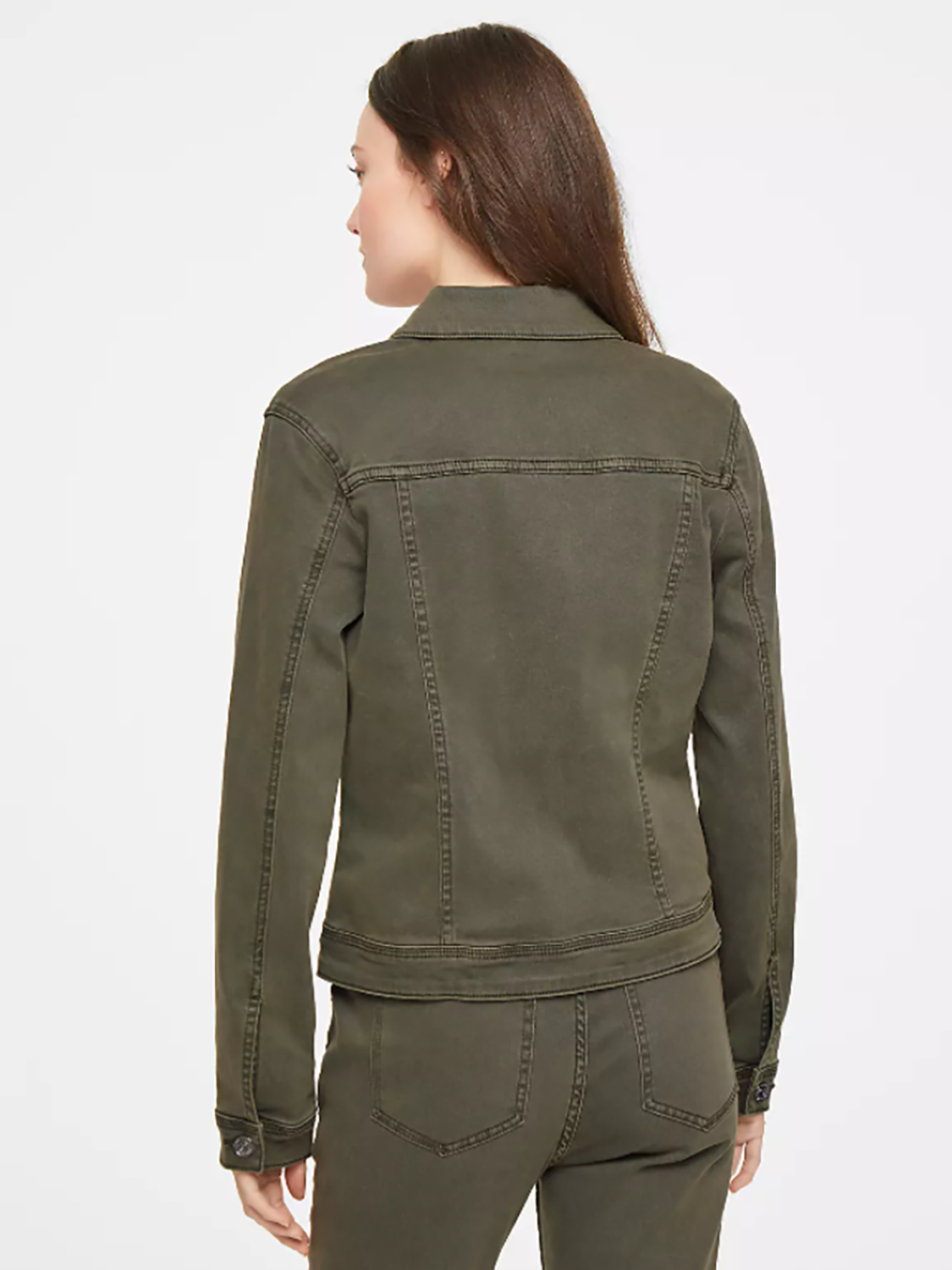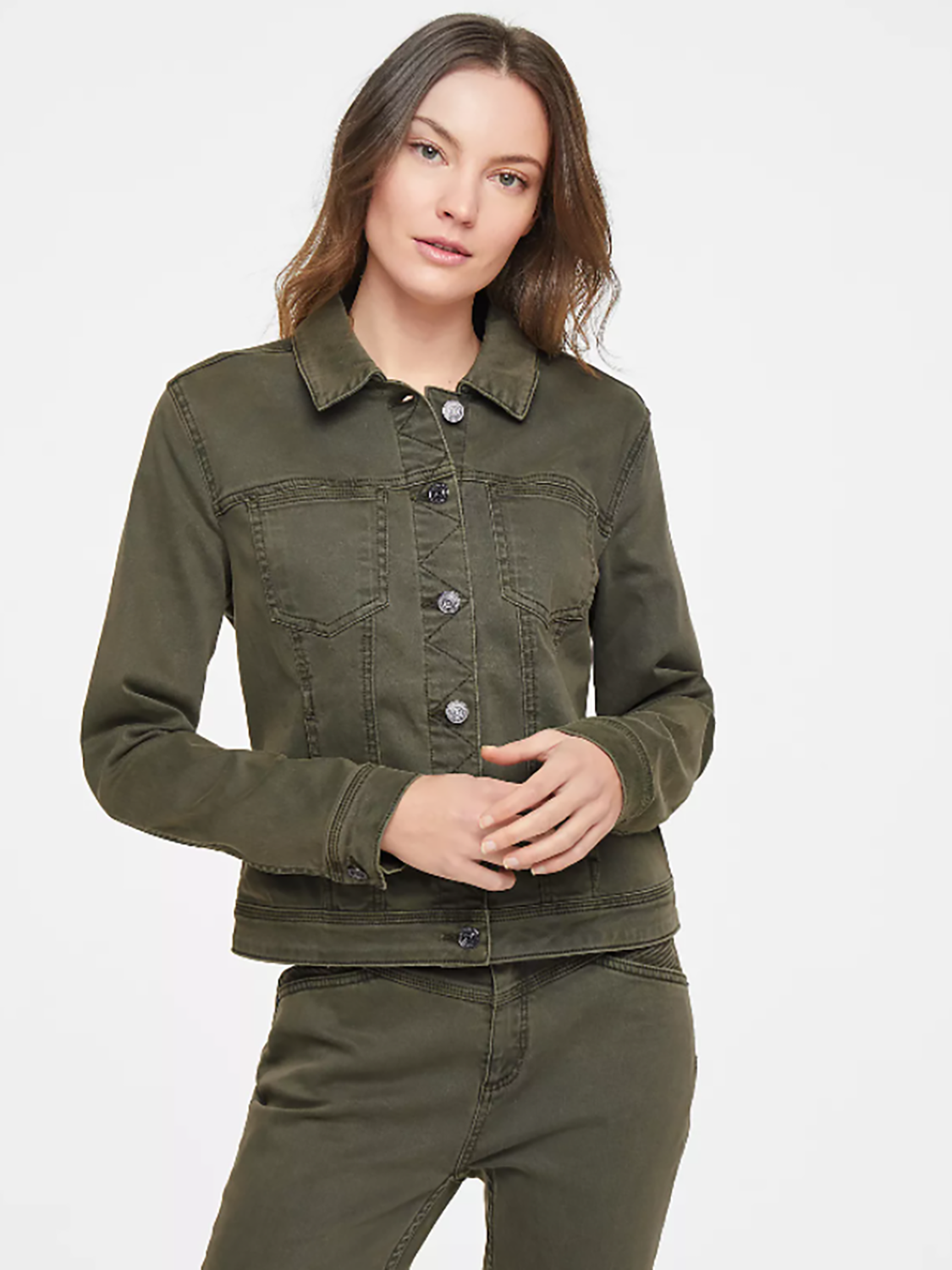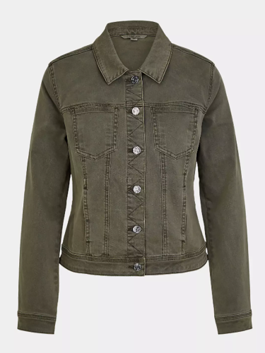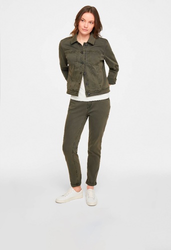Однотонная джинсовка цвета хаки – универсальная вещь для повседневного городского образа. Отложной рубашечный воротник, накладные карманы с клапаном на груди. Втачной рукав полной длины.