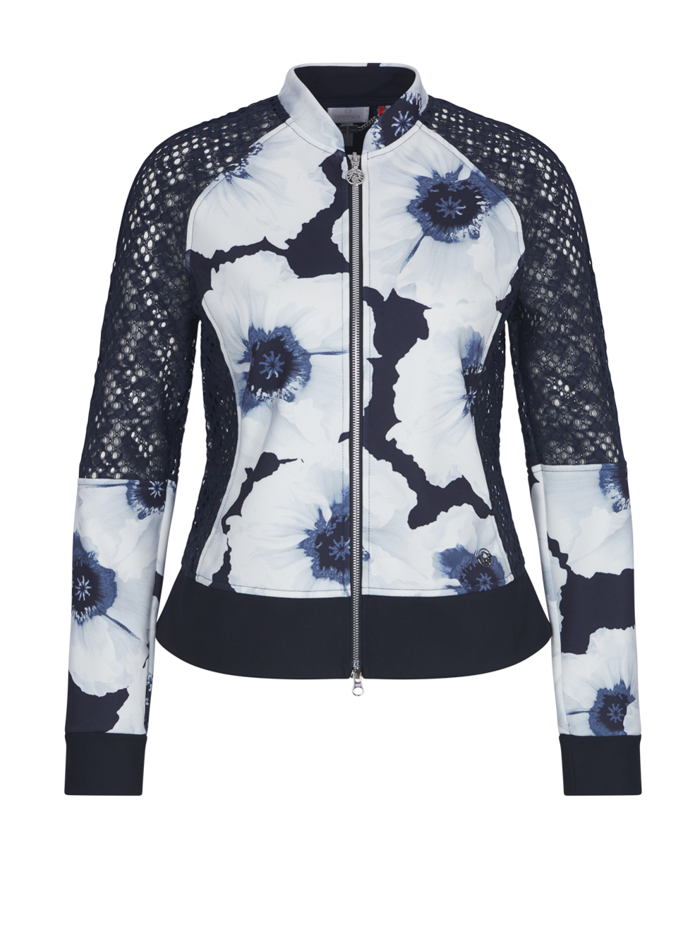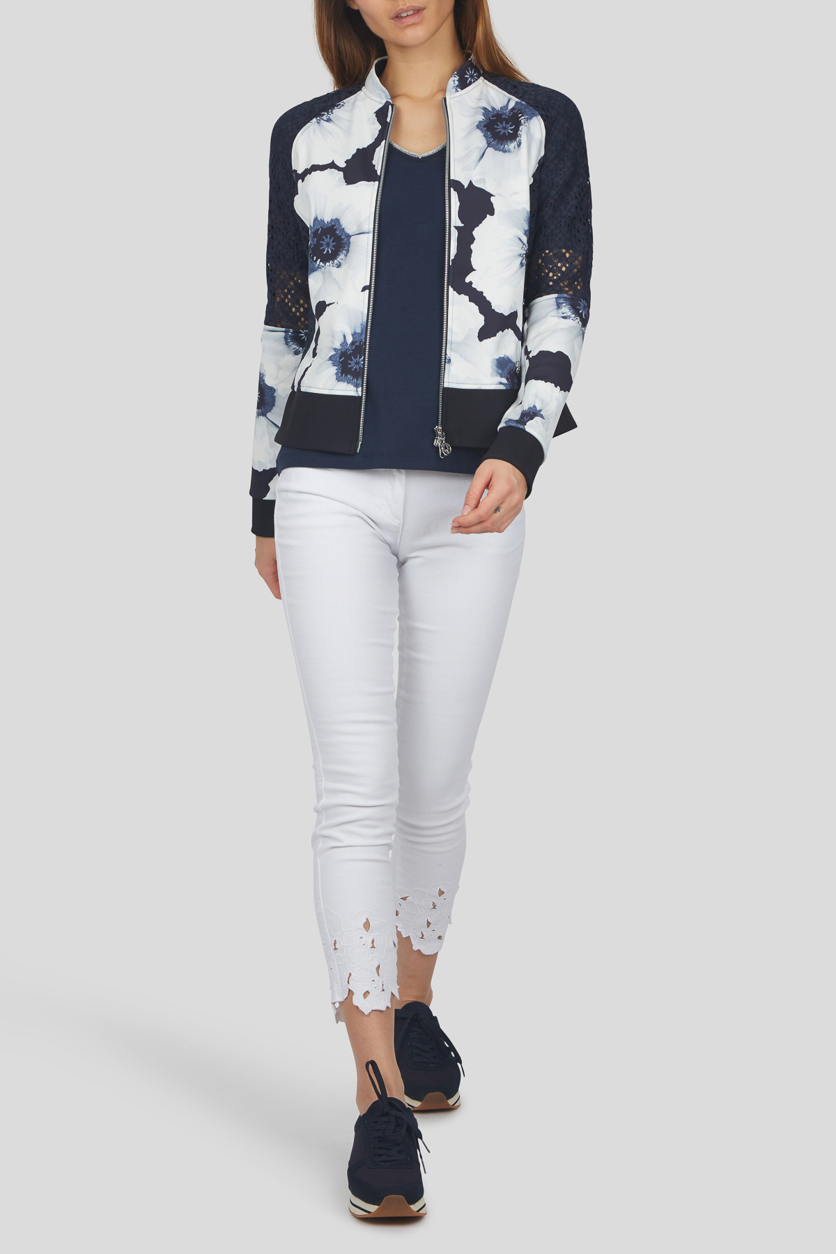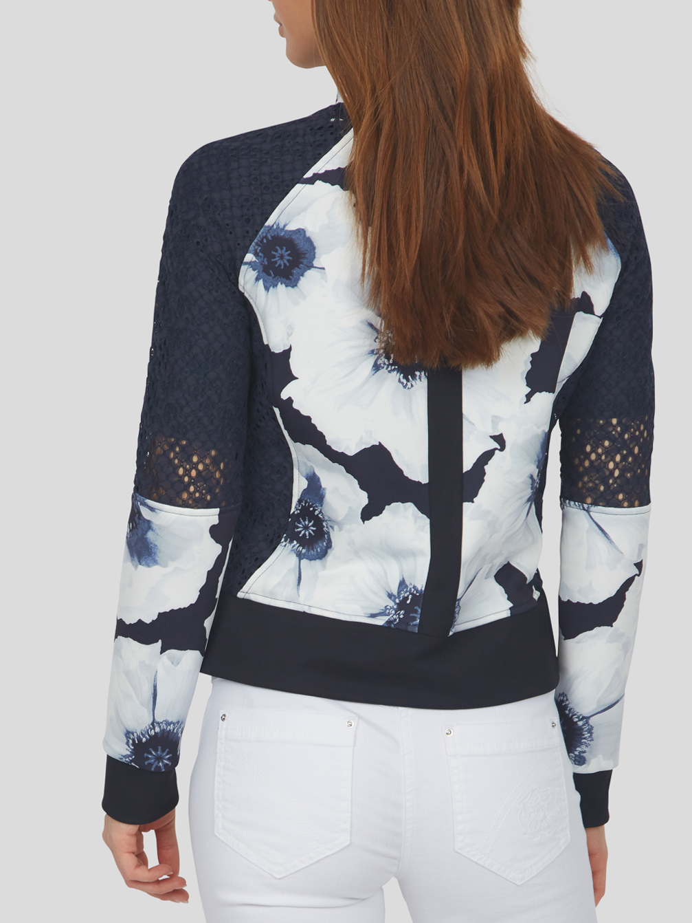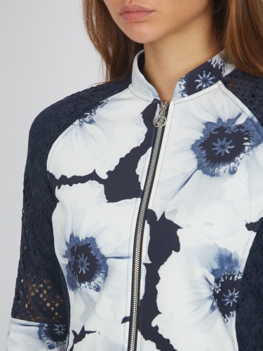Приталенный блейзер на молнии выполнен в цветочном узоре. Рукав реглан состоит из сетки крупной вязки до сгиба локтя. По низу рукава эластичный манжет, также эластичная лента идет по низу изделия.