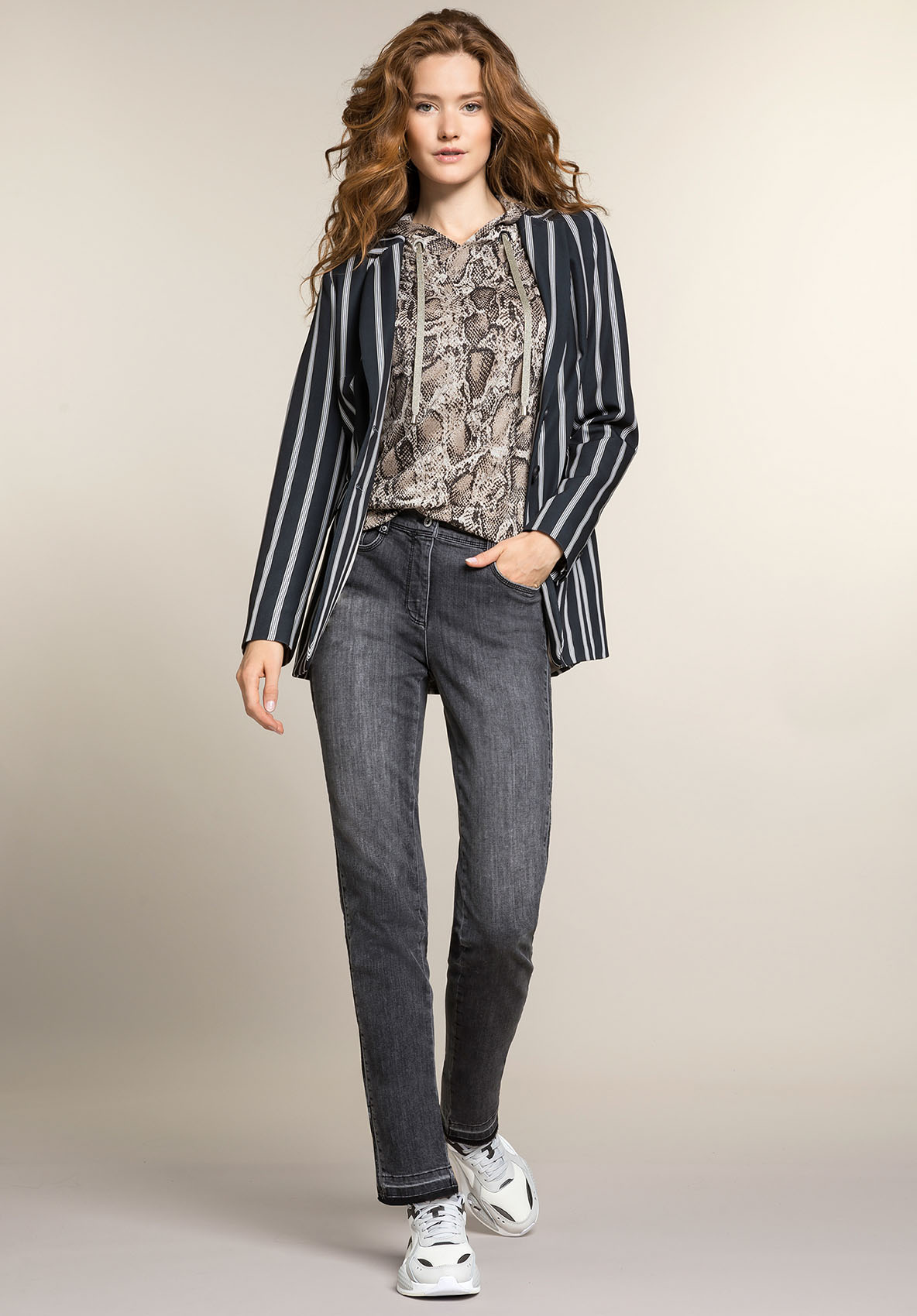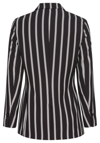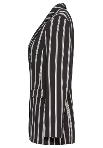 Отличный выбор - стильный жакет Joanna с принтом в полоску. Модная длина - абсолютный маст-хэв этого сезона. Эластичный материал на подкладке особенно удобен в ношении. В дизайне жакета сочетаются такие признаки классического стиля, как простой крой, воротник с лацканами, застежка на пуговице и карманы на клапанах. Длинный жакет в сочетании с джинсами и кроссовками создает современный образ. • длинный жакет в полоску • качественный эластичный материал на подкладке • узкие вертикальные полосы белого и бежевого цвета • карманы на клапанах, воротник с лацканами, застежка на пуговицах • длина около 72 см