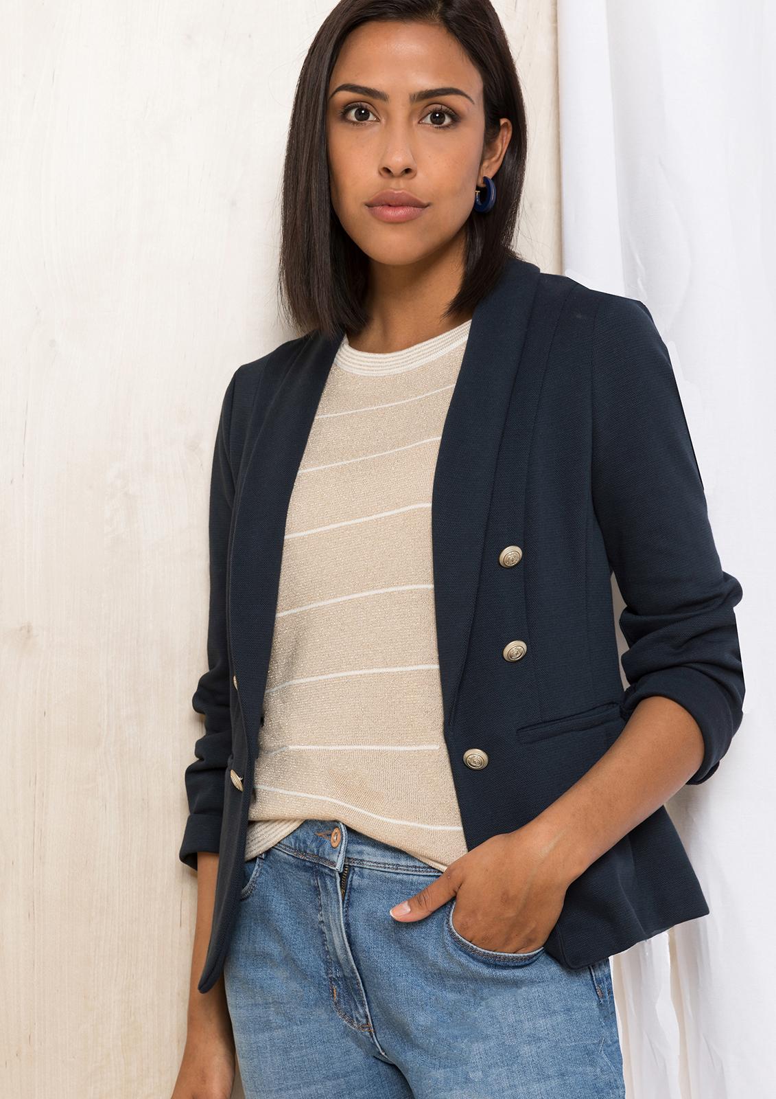 Однотонный жакет подойдет как для делового стиля, так и для повседневного городского образа. Пиджачный воротник с лацканами. Акцентные крупные пуговицы. Боковые прорезные карманы с листочкой. Втачной рукав полной длины.