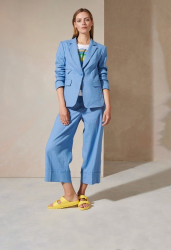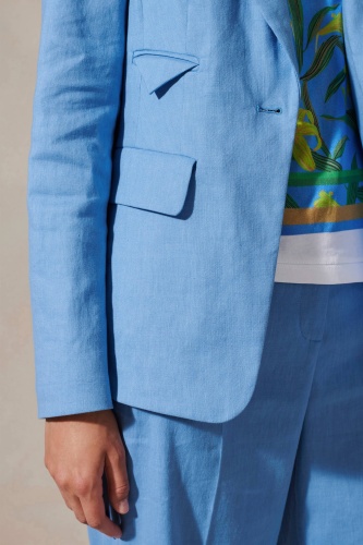 Hемецкий бренд. На сайте указаны Российские размеры. Блейзер на полуподкладке из эластичной смеси льна и хлопка габардиновой ткани. Воротник с лацканами, три кармана с клапанами и застежка на пуговицы определяют классический дизайн.