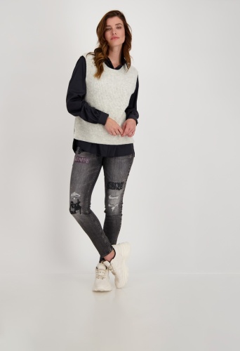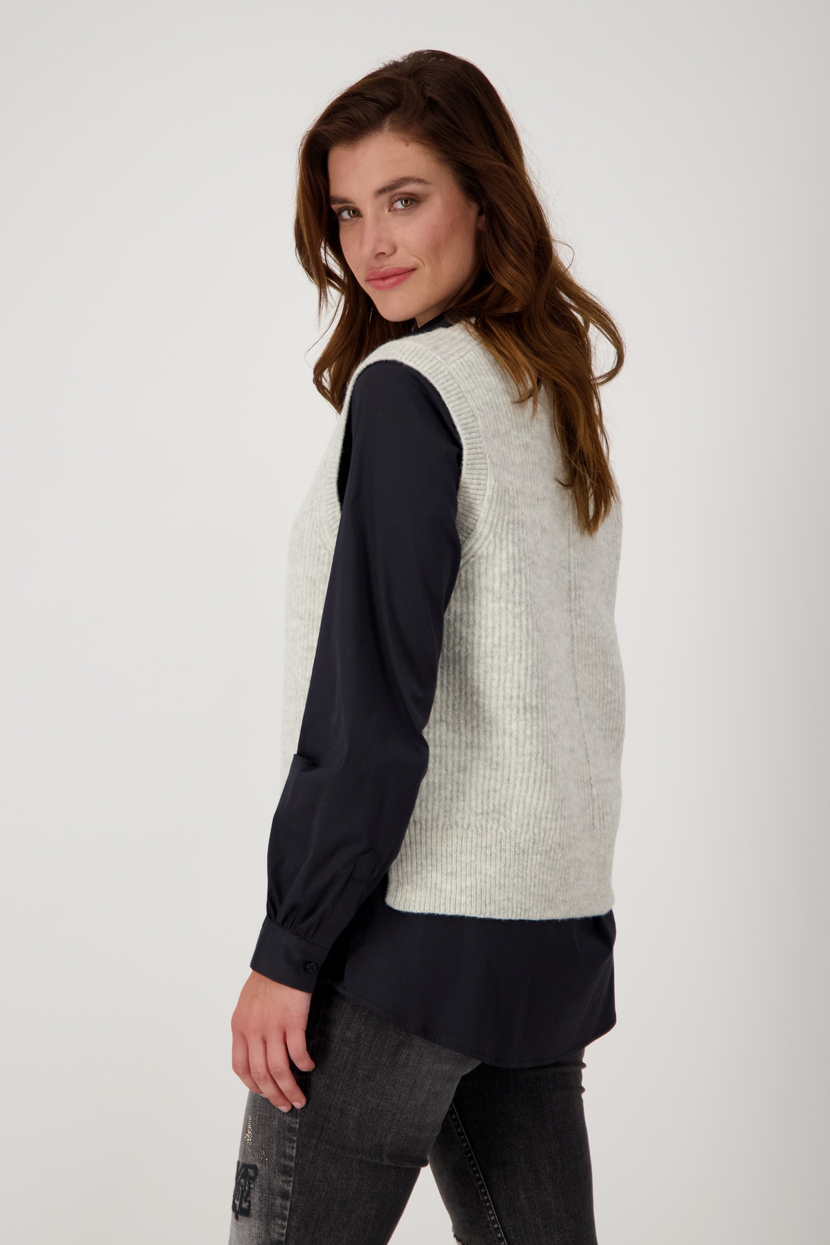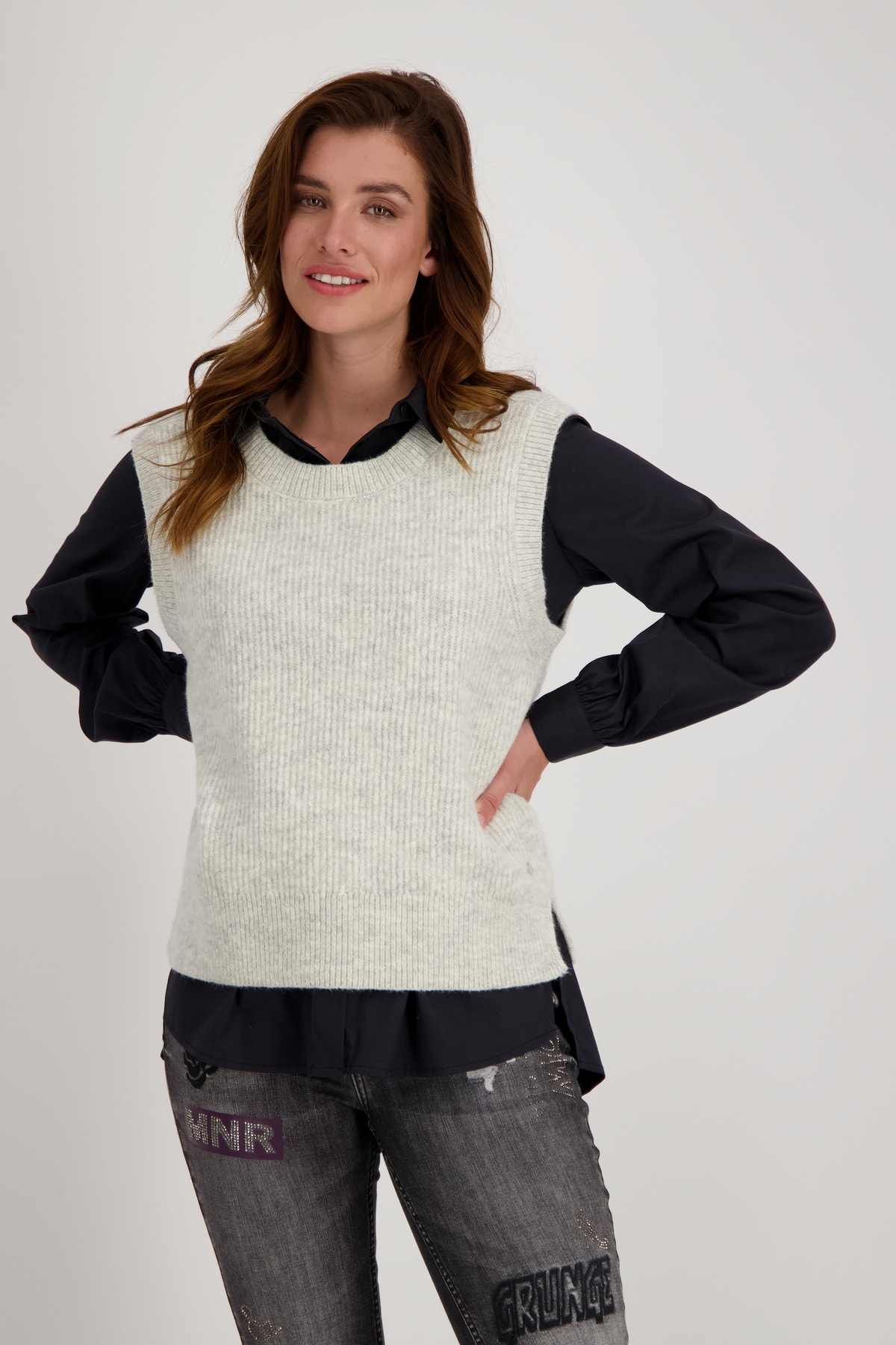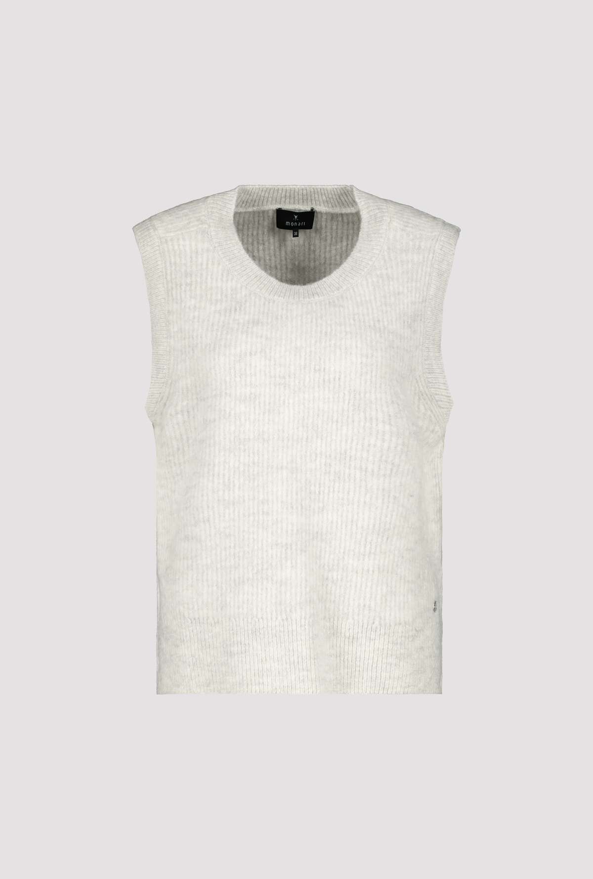 На сайте указаны российские размеры. Жилет гладкой вязки с круглым вырезом. Прямой фасон без рукавов с круглым вырезом горловины, широкими манжетами на кромке и на указанных концах рукавов, а также прохладными боковыми разрезами определяют внешний вид этой довольно простой модели свитера. Модель ростом 179 см.