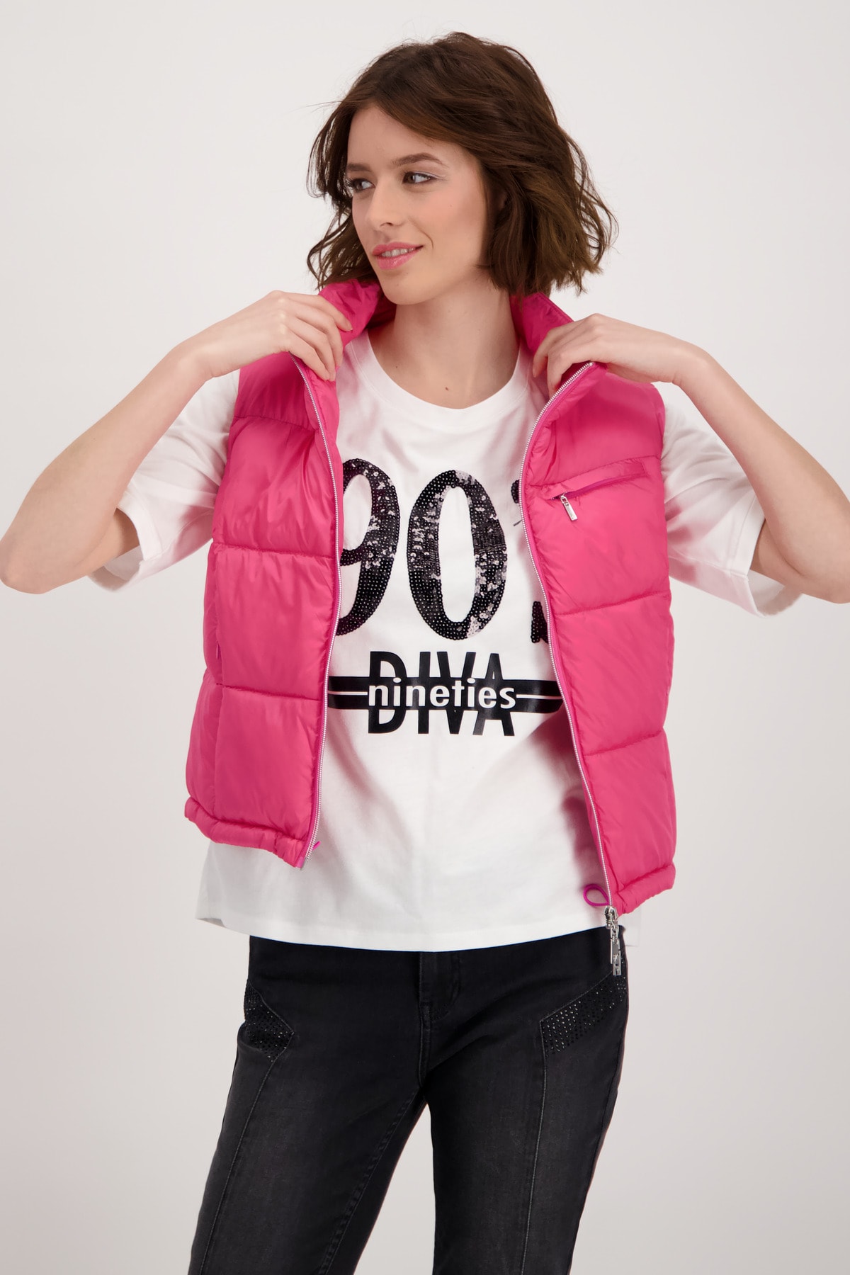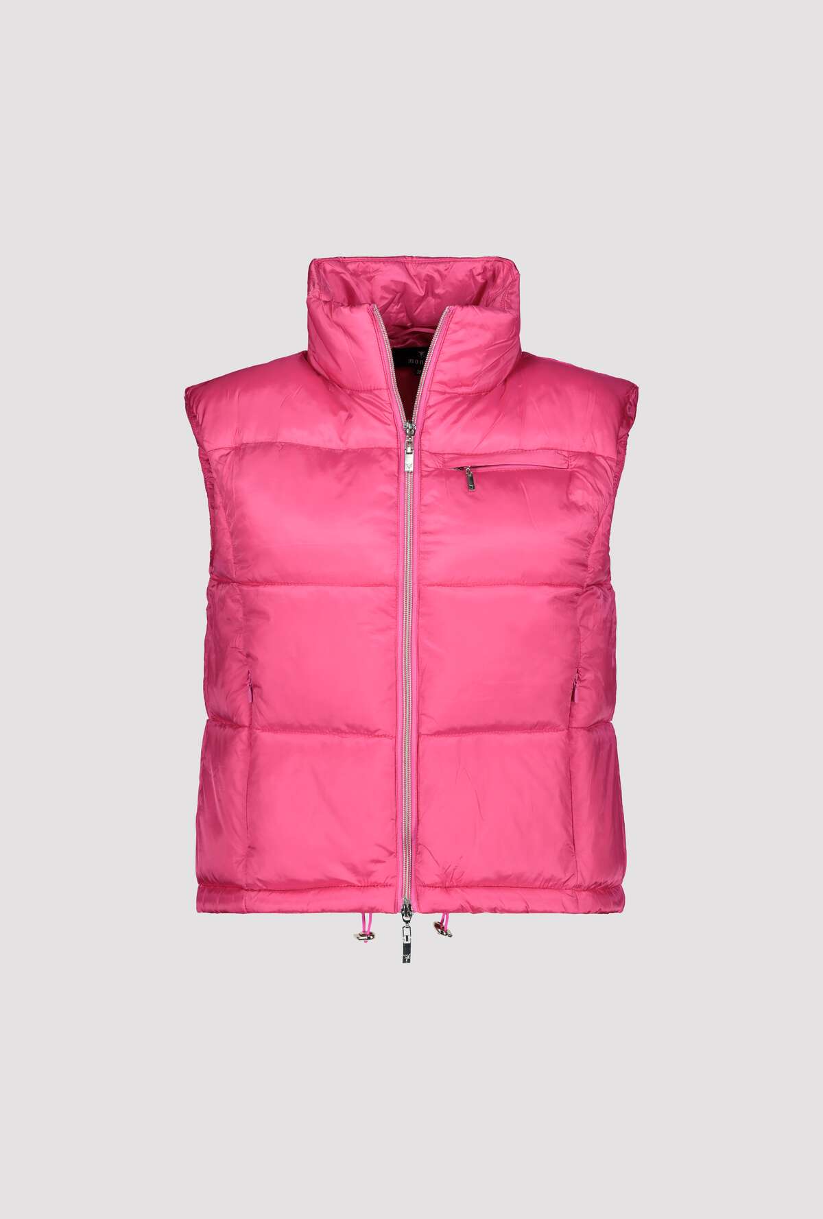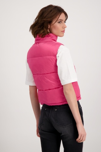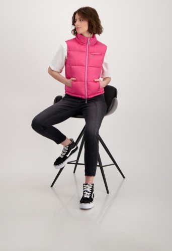 На сайте указаны российские размеры. Короткий стеганый жилет с молнией и карманами. Модель с двусторонней молнией легко расстегивается и закрывается, а передняя часть модели с воротником-стойкой дополнена двумя прорезными карманами на молнии и прорезным карманом на уровне груди. Подол легко регулируется благодаря кулиске с резинками и стопорами шнура. Подарите своим нарядам особое обновление. Модель ростом 178 см. Длина по спинке 44 размера составляет 54 см, а по переду — 56 см.