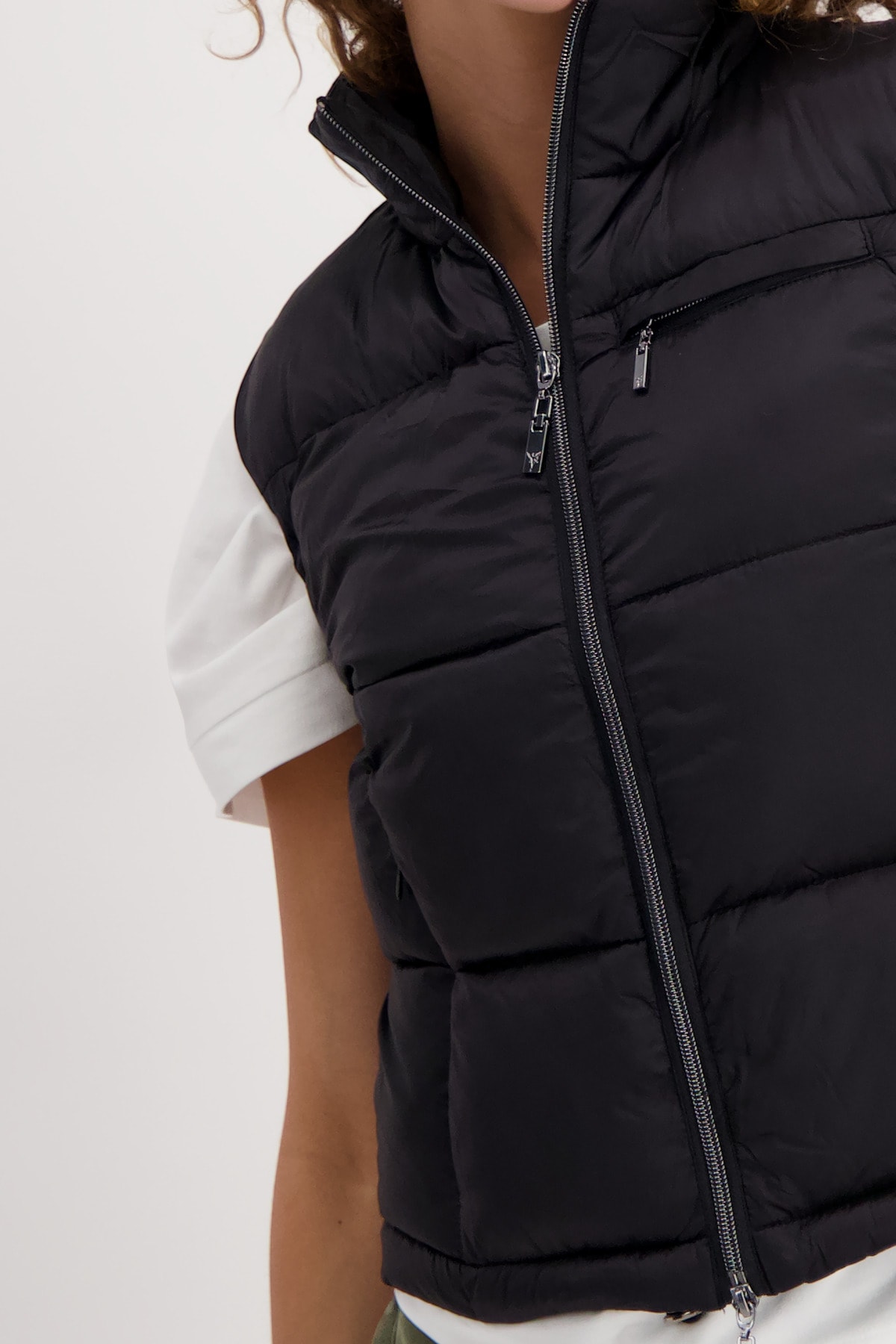 На сайте указаны российские размеры. Короткий стеганый жилет с молнией и карманами. Модель с двусторонней молнией легко расстегивается и закрывается, а передняя часть модели с воротником-стойкой дополнена двумя прорезными карманами на молнии и прорезным карманом на уровне груди. Подол легко регулируется благодаря кулиске с резинками и стопорами шнура. Подарите своим нарядам особое обновление. Рост модели 176 см. Длина по спинке 44 размера составляет 54 см, а по переду – 56 см.