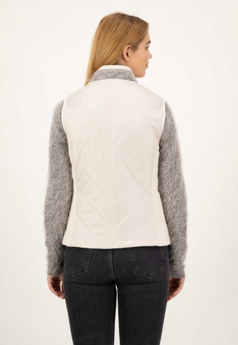 На сайте указаны российские размеры. Стеганая безрукавка из эксклюзивного сочетания материалов с элегантной трикотажной вставкой. Изюминкой стеганого жилета являются модный вязаный воротник и блестящие контрастные швы. Двусторонняя молния и высокий застегивающийся воротник особенно практичны и подчеркивают приятный комфорт при ношении. Наша модель ростом 177 см. Измерения для 44 размера: Окружность груди: 102 см Талия: 95,1 см Бедра: 42 дюйма Длина спинки: 60 см.