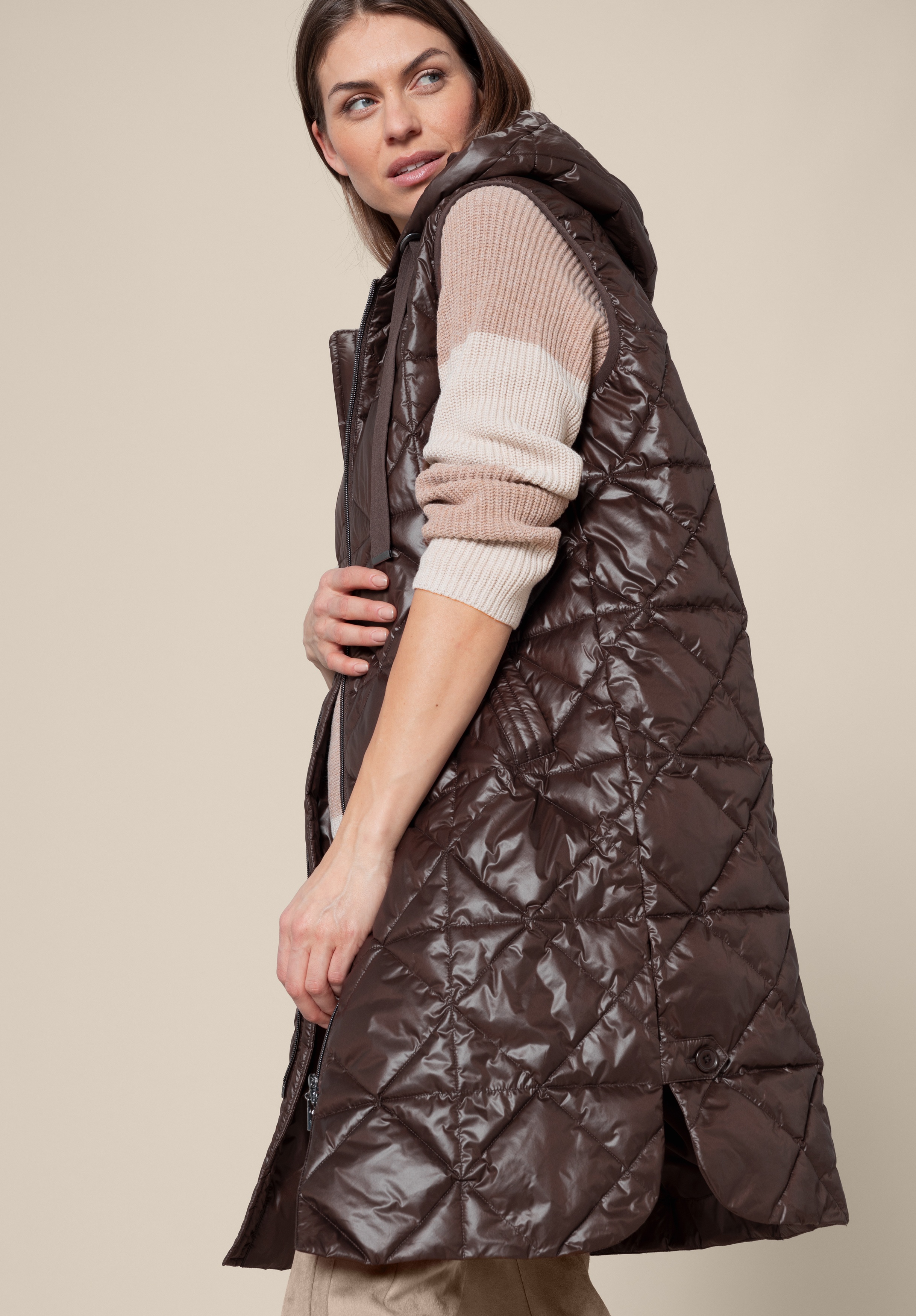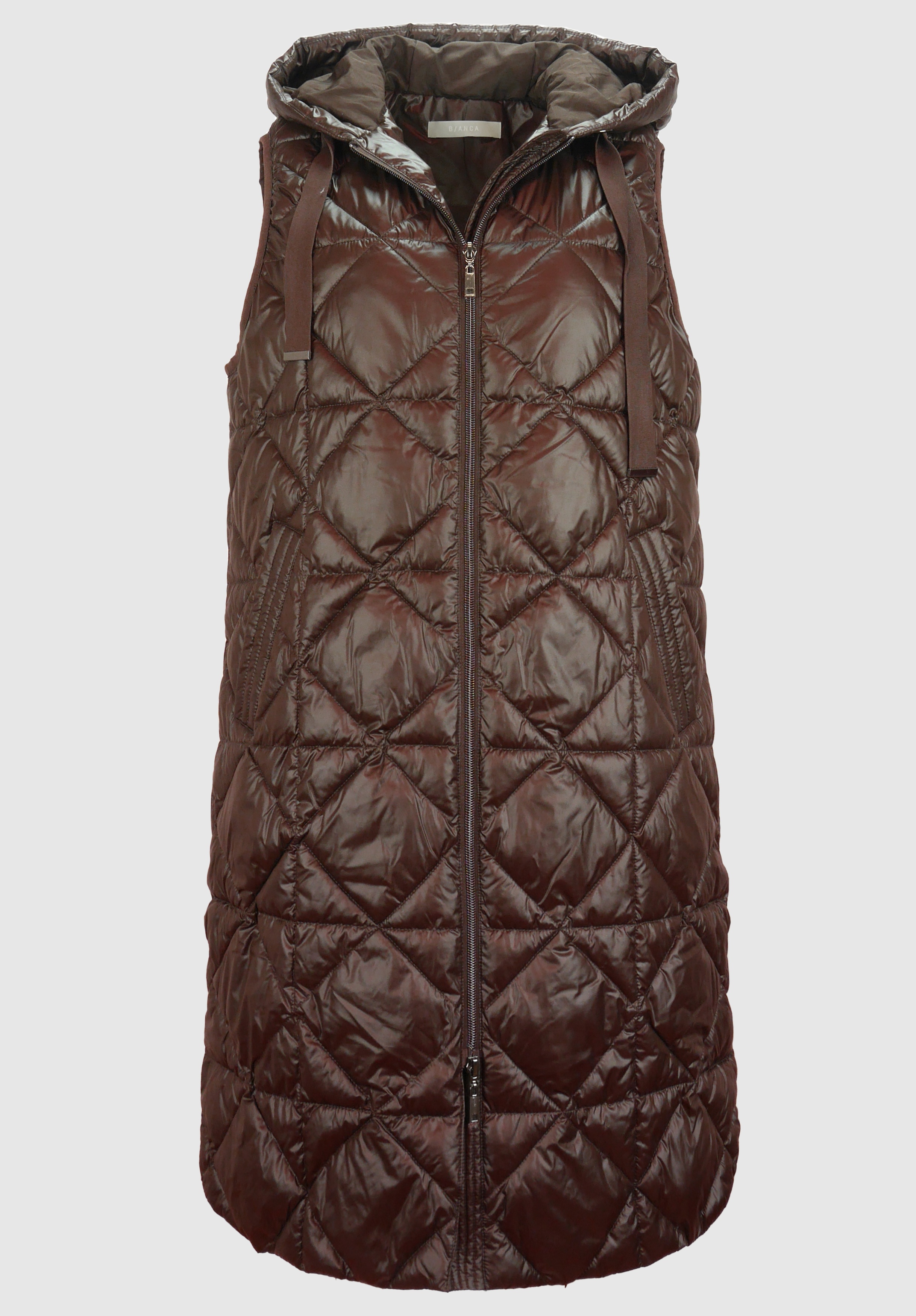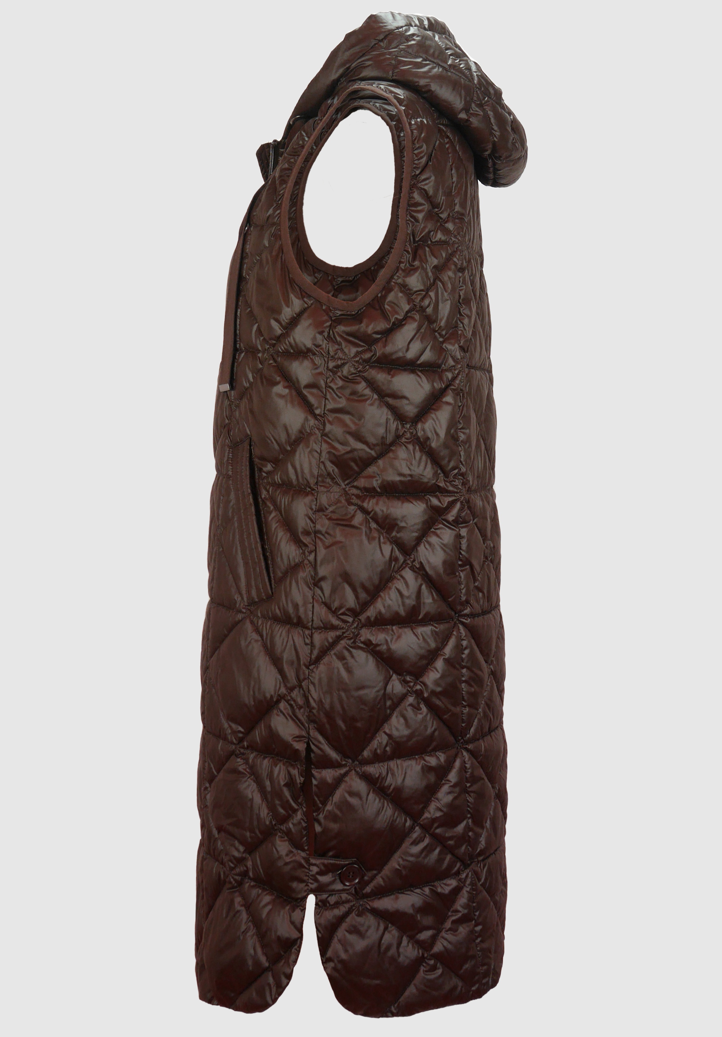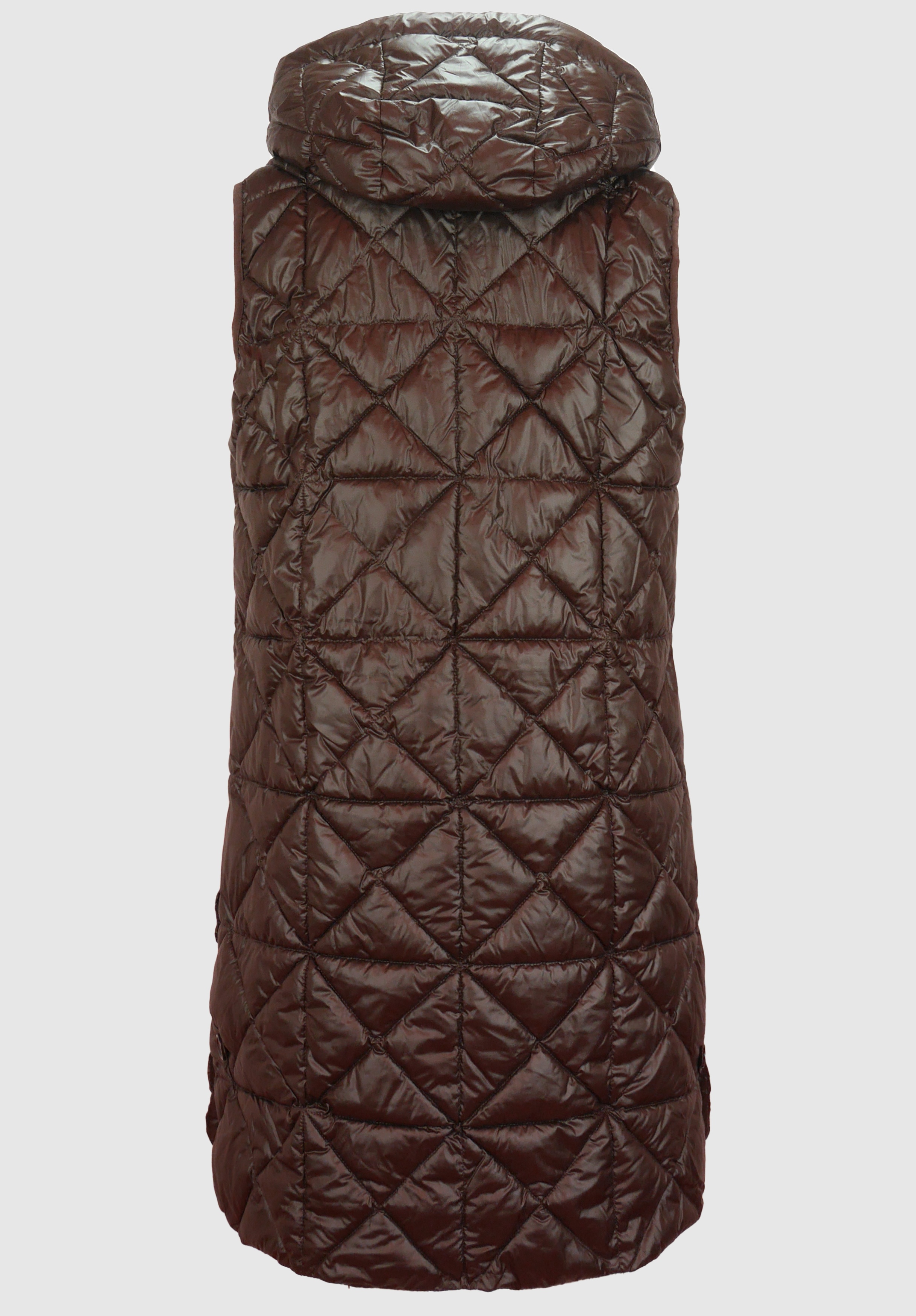 На сайте указаны российские размеры. Длинный стеганый жилет со слегка блестящим эффектом. Полиэстер высокого качества. Боковые карманы, капюшон с кулиской, двусторонняя молния. Прямой крой и посадка, без талии. Длина жилета - 97 см.