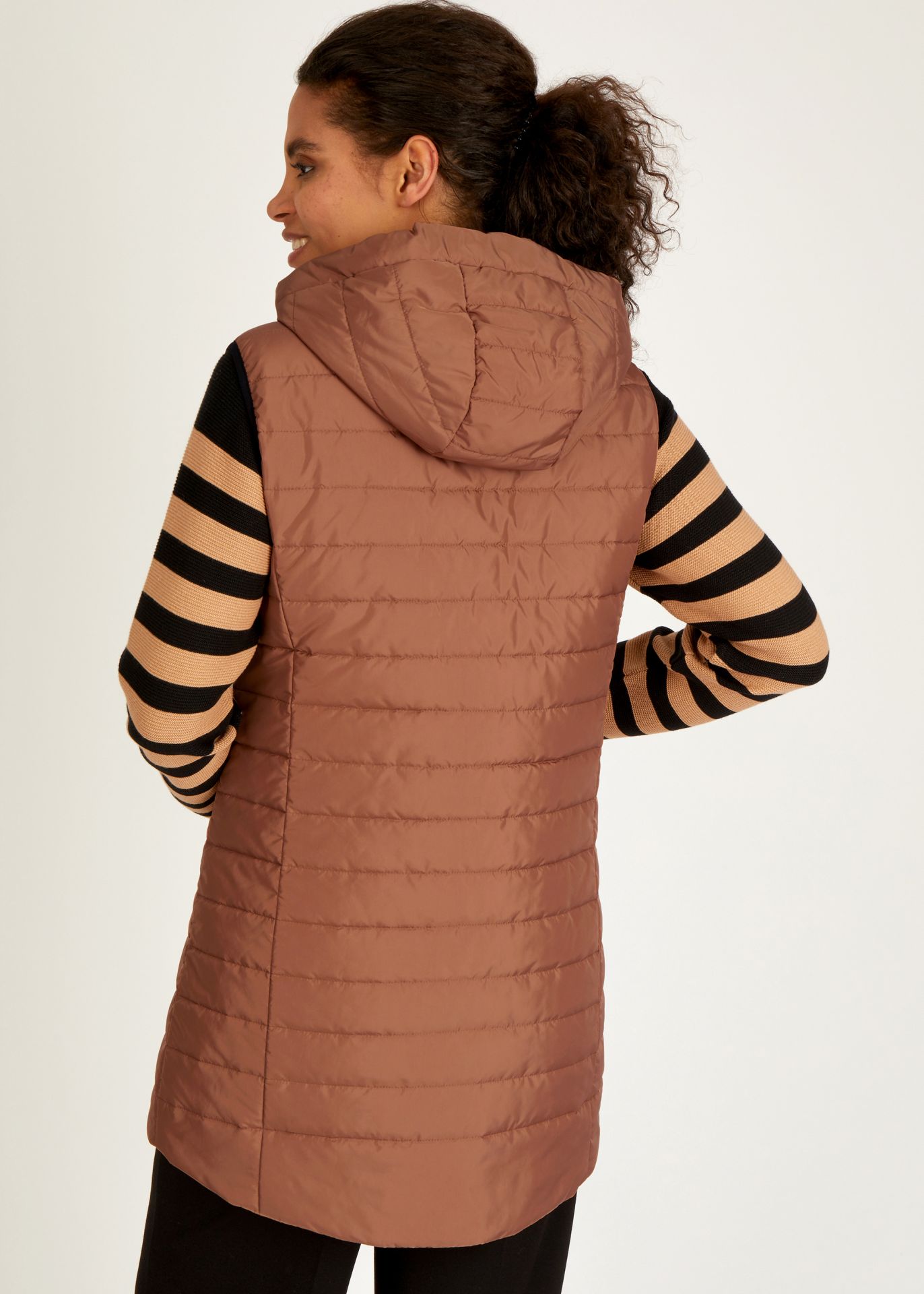 На сайте указаны российские размеры. Этот шикарный стеганый жилет с капюшоном идеально подходит для любого активного отдыха. Капюшон регулируется шнурком. Жилет закрывается на молнию, как и боковые карманы. Прямой крой придает спортивный вид. Носите жилет с джинсами и ботинками. Рост модели 176 см. Длина по спинке от плеча: 86 см.