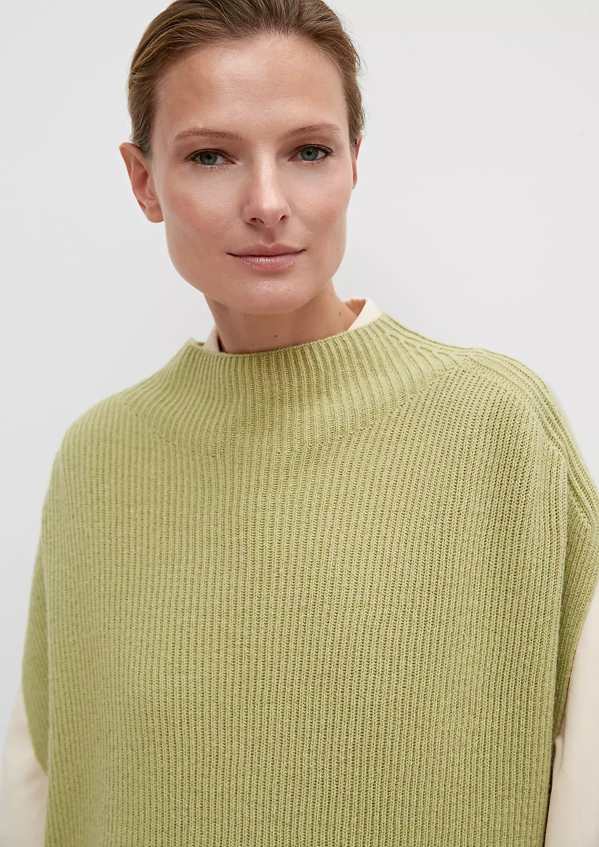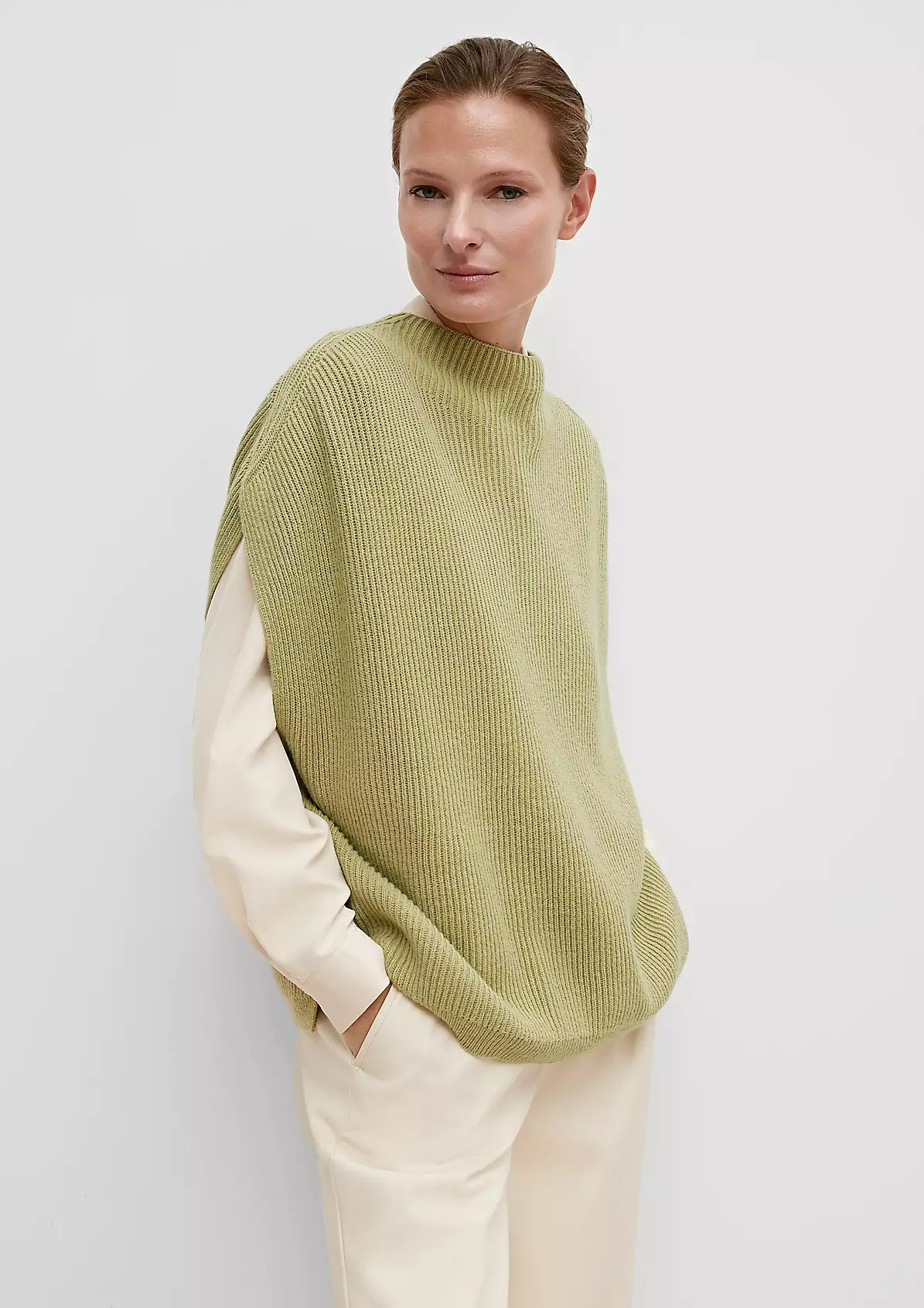 На сайте указаны российские размеры. Пончо из смесовой шерсти свободного кроя. Без рукавов, заниженная линия плеча. Длина по спинке 62 см. Рост модели 179 см.