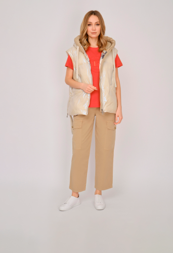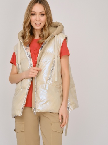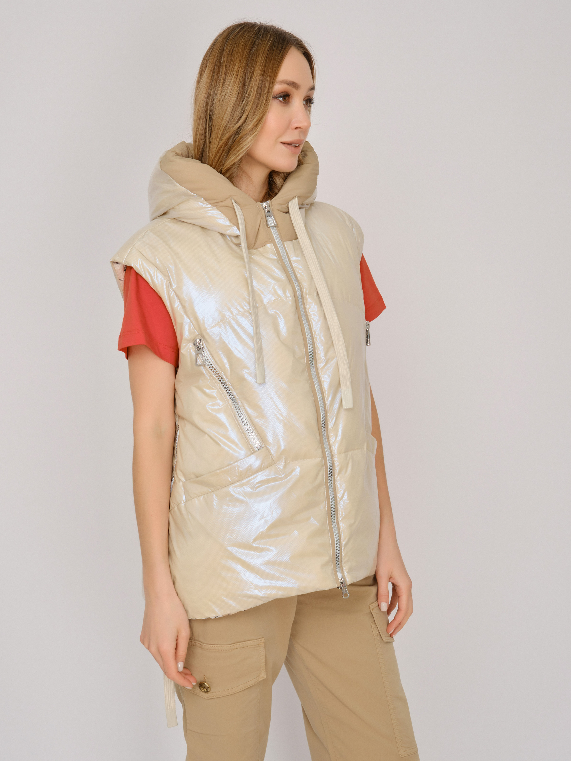 На сайте указаны российские размеры. Свободный светло-бежевый жилет на молнии, с капюшоном на завязках, с прорезными карманами и прорезными карманми на молнии, с боковыми разрезами на молнии и кулиской понизу. Длина по спинке: 68 см. Рост модели: 175 см.