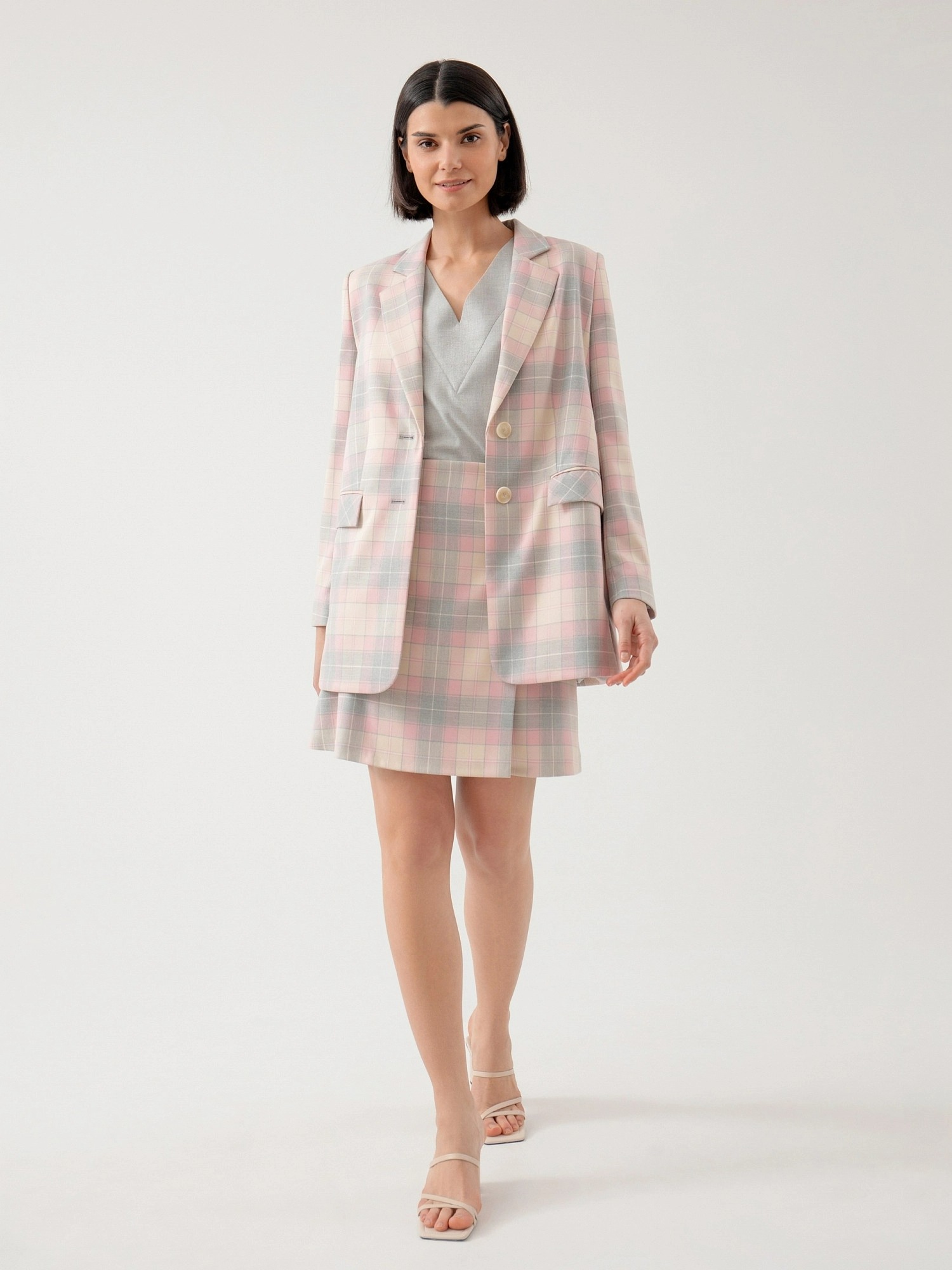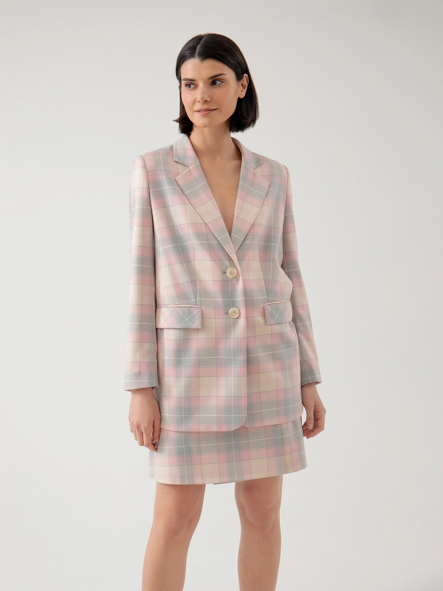 На сайте указаны российские размеры. Удлинённый прямой однобортный жакет с двумя пуговицами из костюмной ткани в серо-розовую клетку. Английский воротник с V-образным вырезом. Жакет с прорезными карманами и накладными клапанами. Жакет полностью на подкладке. Рост модели 175 см.