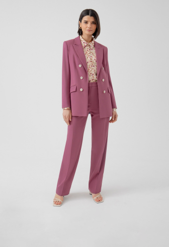 На сайте указаны российские размеры. Прямой удлинённый однобортный жакет с ложной застежкой на пуговицы. Английский воротник с остроконечными лацканами. На полочке два наклонённых кармана с клапанами. Жакет полностью на подкладке и выполнен из костюмной ткани в благородном цвете "амарант". Составит дерзкий ансамбль с широкими брюками из этой же ткани. Рост модели 175 см.