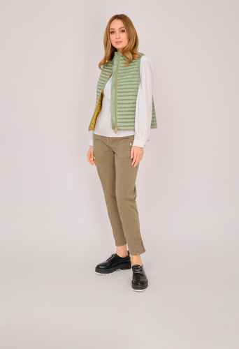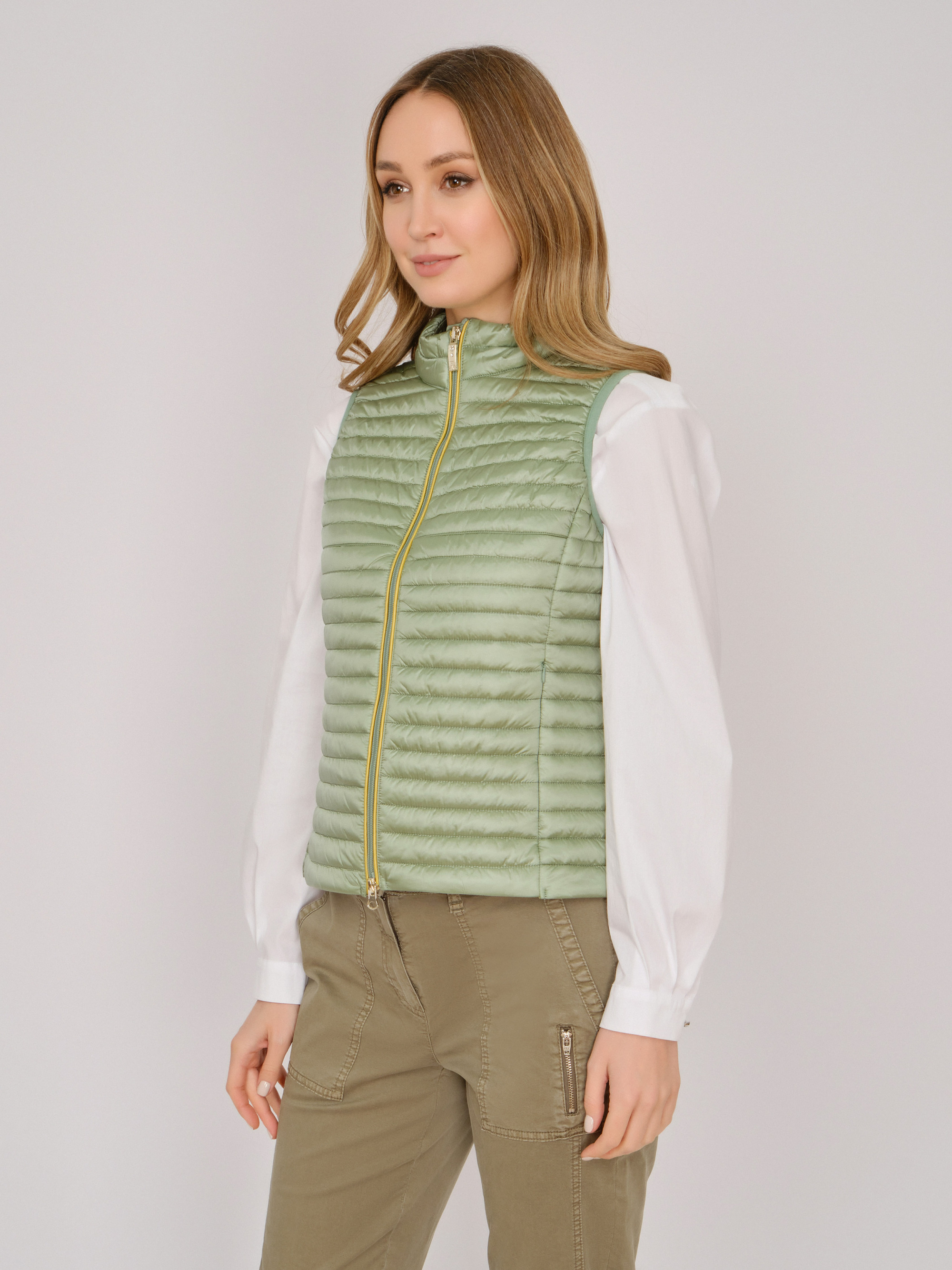 На сайте указаны российские размеры. Полуприталенный стеганный мятный-зеленый жилет на молнии, с карманами в шве на молнии. Длина по спинке: 54 см. Рост модели: 175 см.