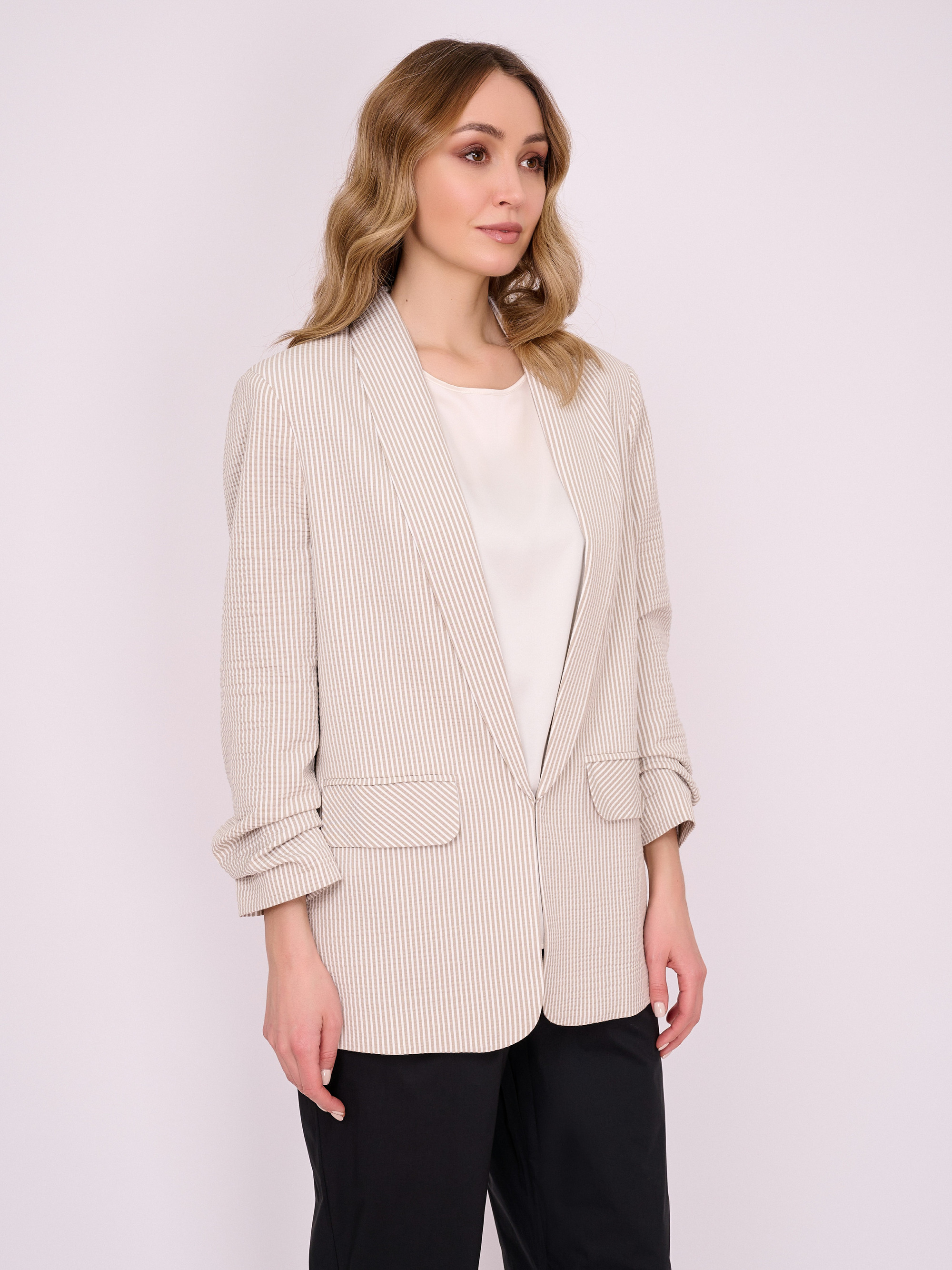 На сайте указаны российские размеры. Жакет прямого покроя с рукавами 7/8, присборенными над запястьем, прорезными карманами с клапанами. Длина по спинке: 70 см. Рост модели 175 см.