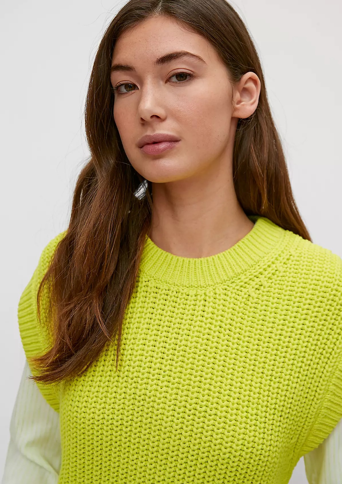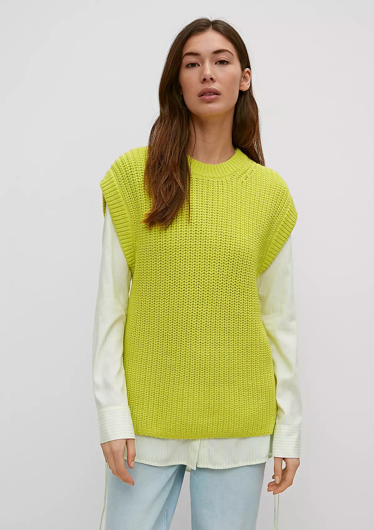 На сайте указаны российские размеры. Вязаный жилет из трикотажа, круглый вырез горловины с окантовкой в рубчик. Подол с разрезом по бокам. Длина спины 65 см в размере 42 Рост модели 178 см.