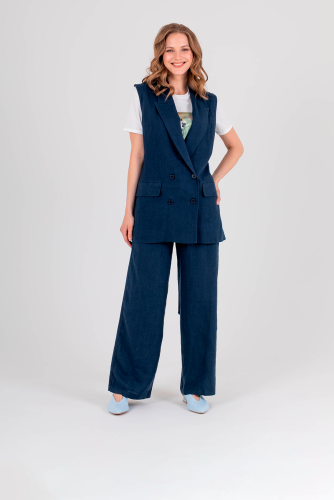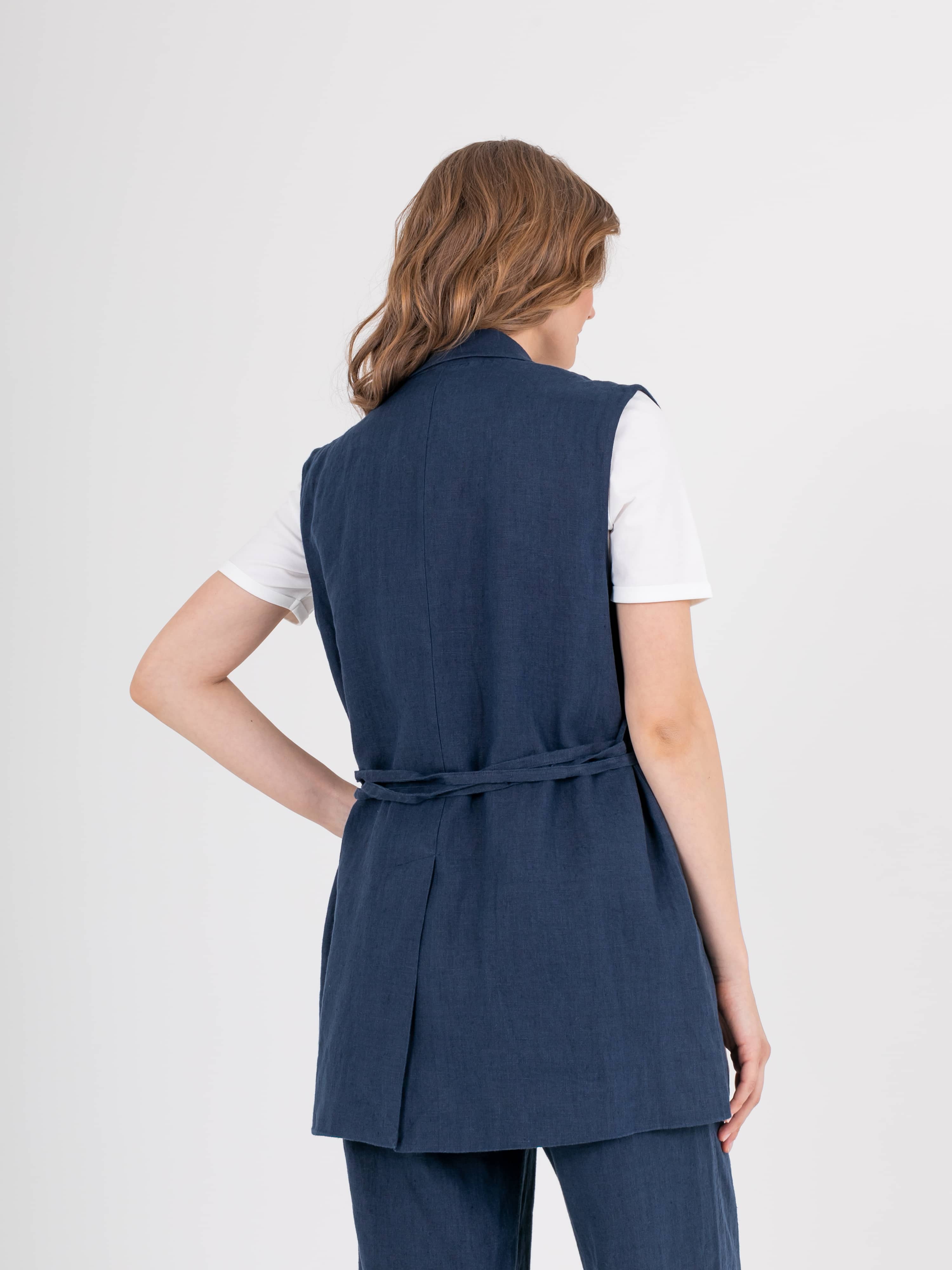 Жилет удлиненный прямого силуэта, с застежкой на две прорезные петли и пуговицы из 100% льна. Перед на запах со шлевками и съемным поясом, в области груди расположен карман с листочкой, а также прорезные карманы с клапанами. Спинка со средним швом и шлицей. Воротник пиджачного типа.