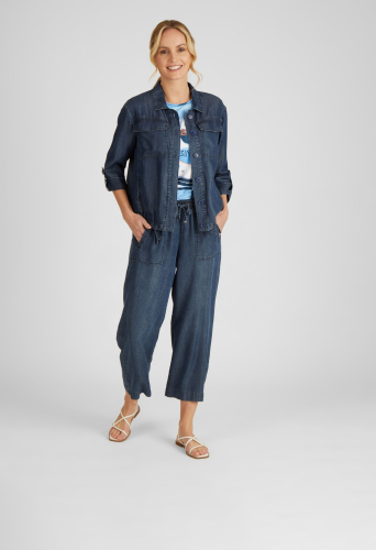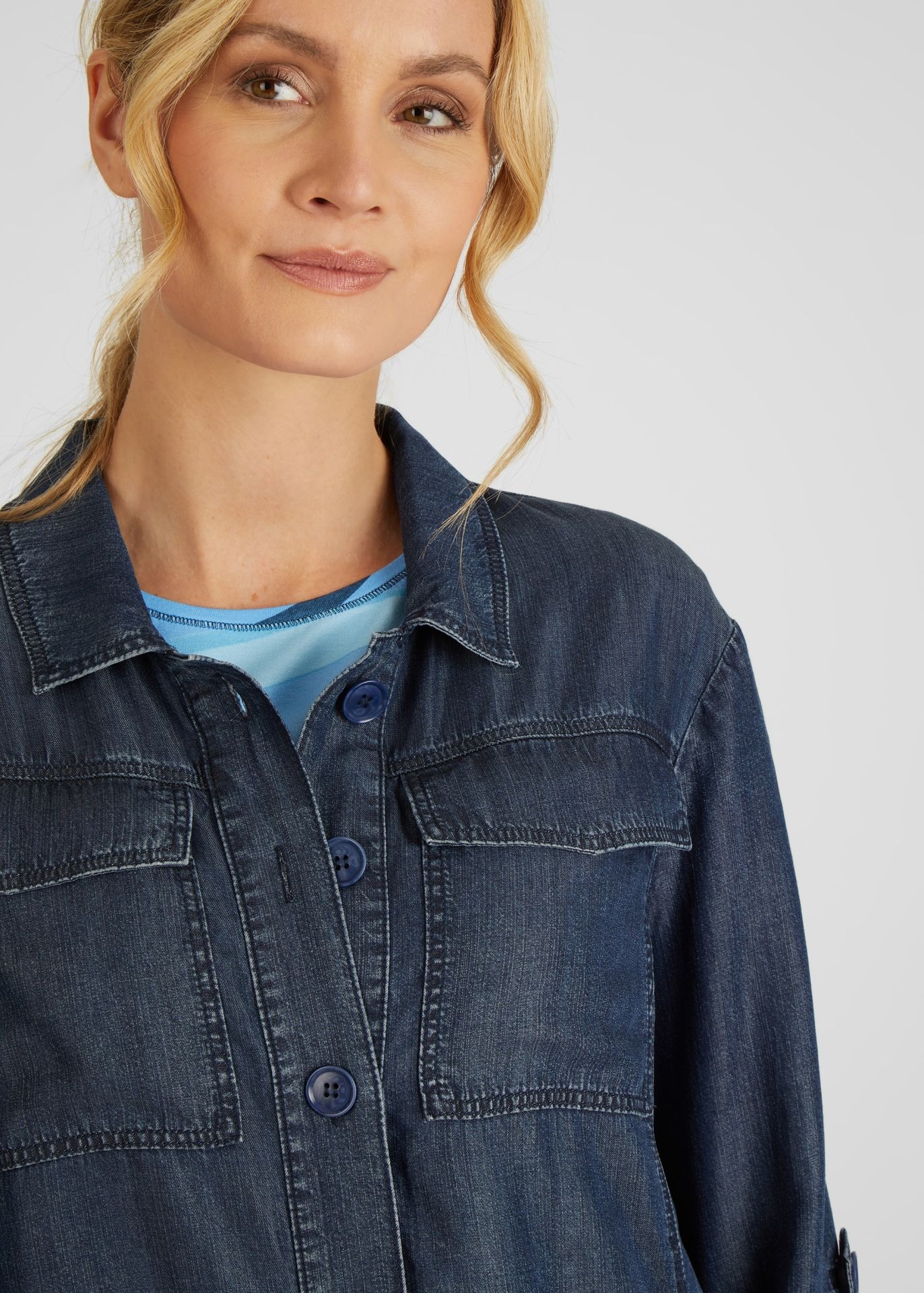 Модная куртка на пуговицах с рукавами 3/4 в джинсовом стиле и рубашечным воротником - абсолютный must-have для каждой женщины, следящей за трендами! Широкая форма обеспечивает удобную посадку, а кулиска на кромке позволяет регулировать куртку индивидуально. Куртка имеет практичные боковые карманы и стильные нагрудные карманы.