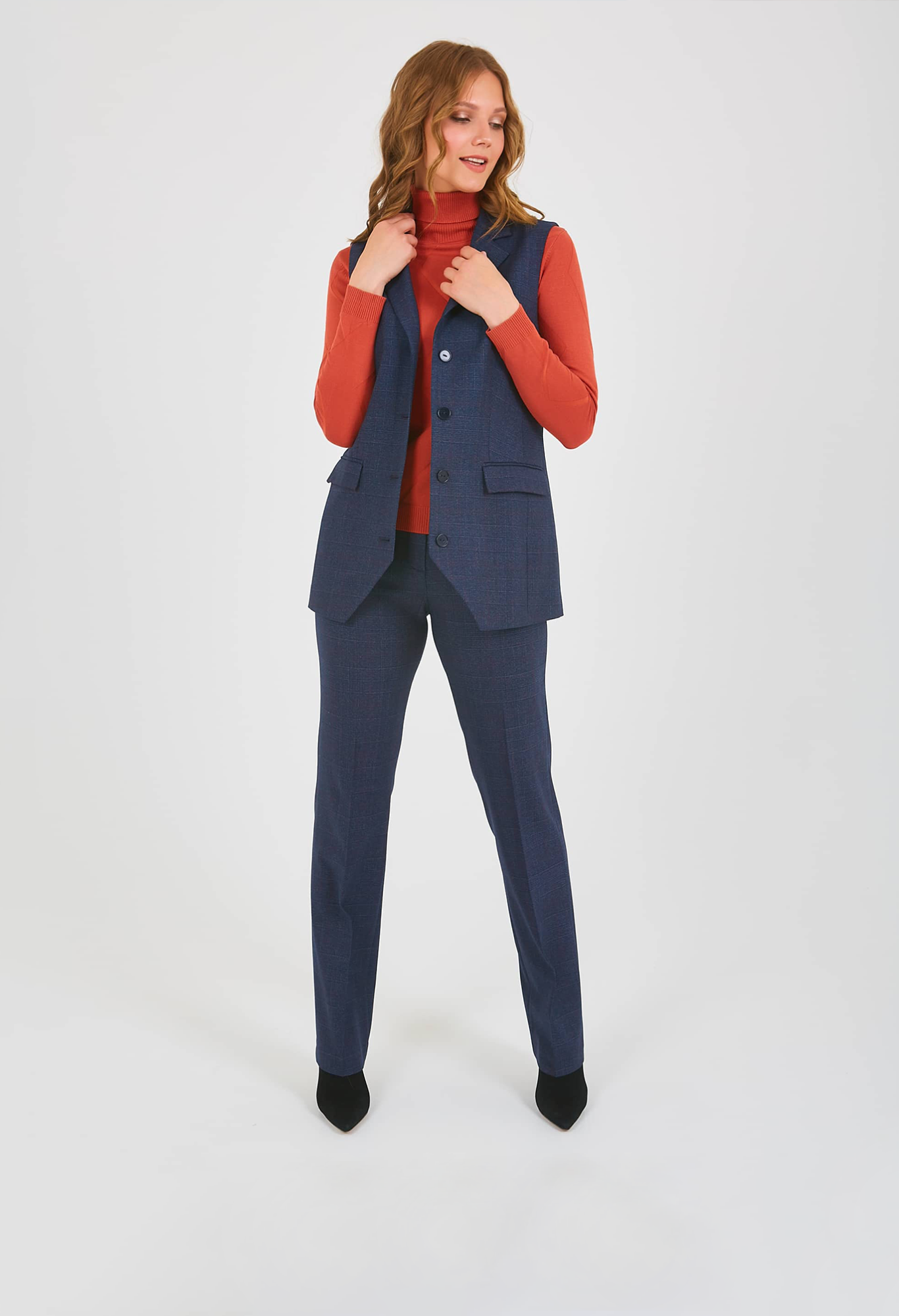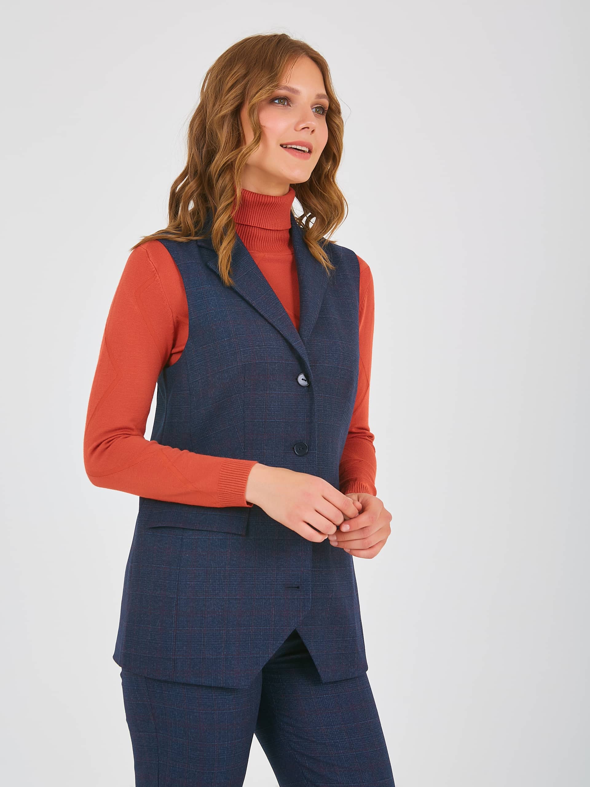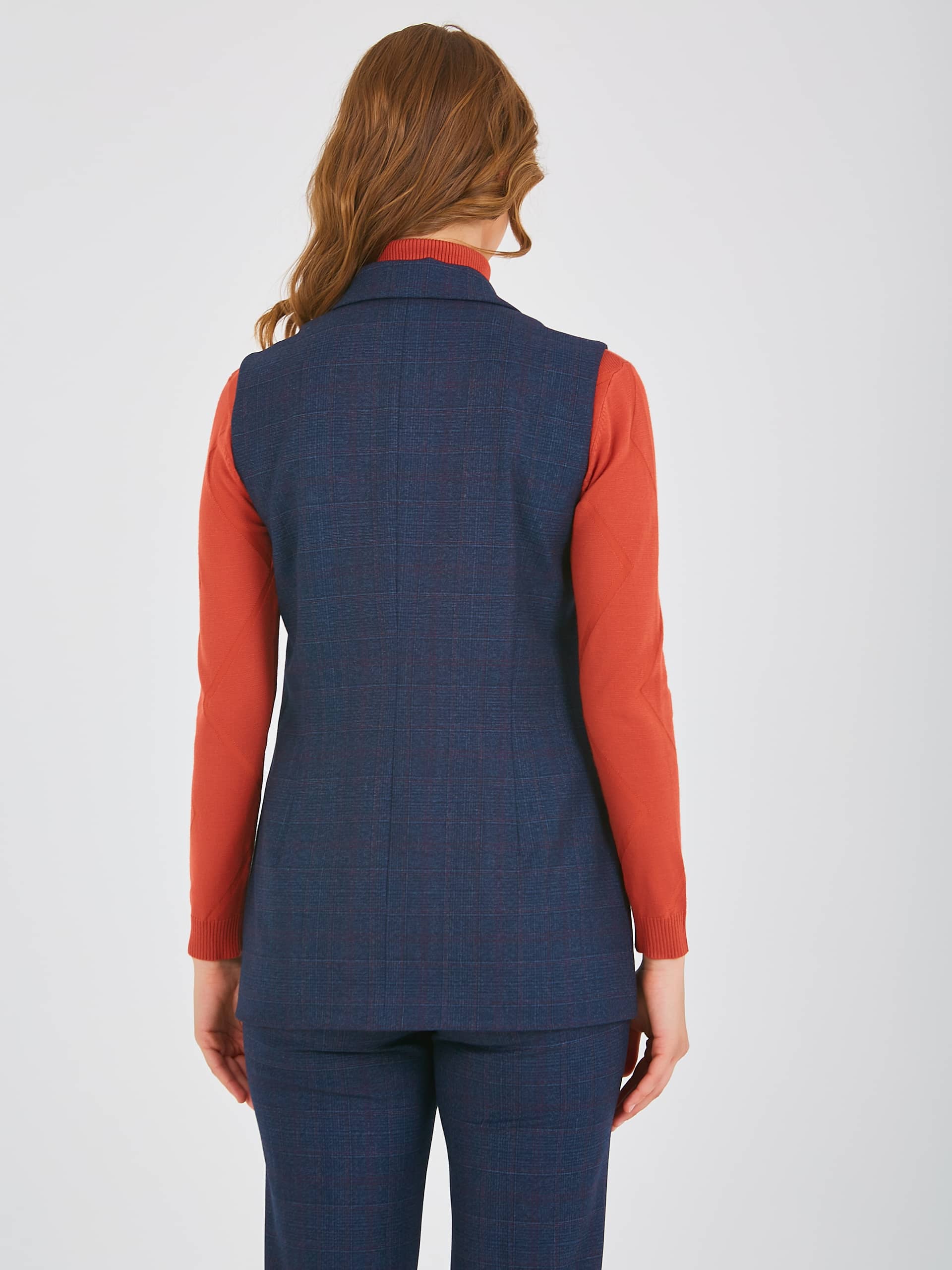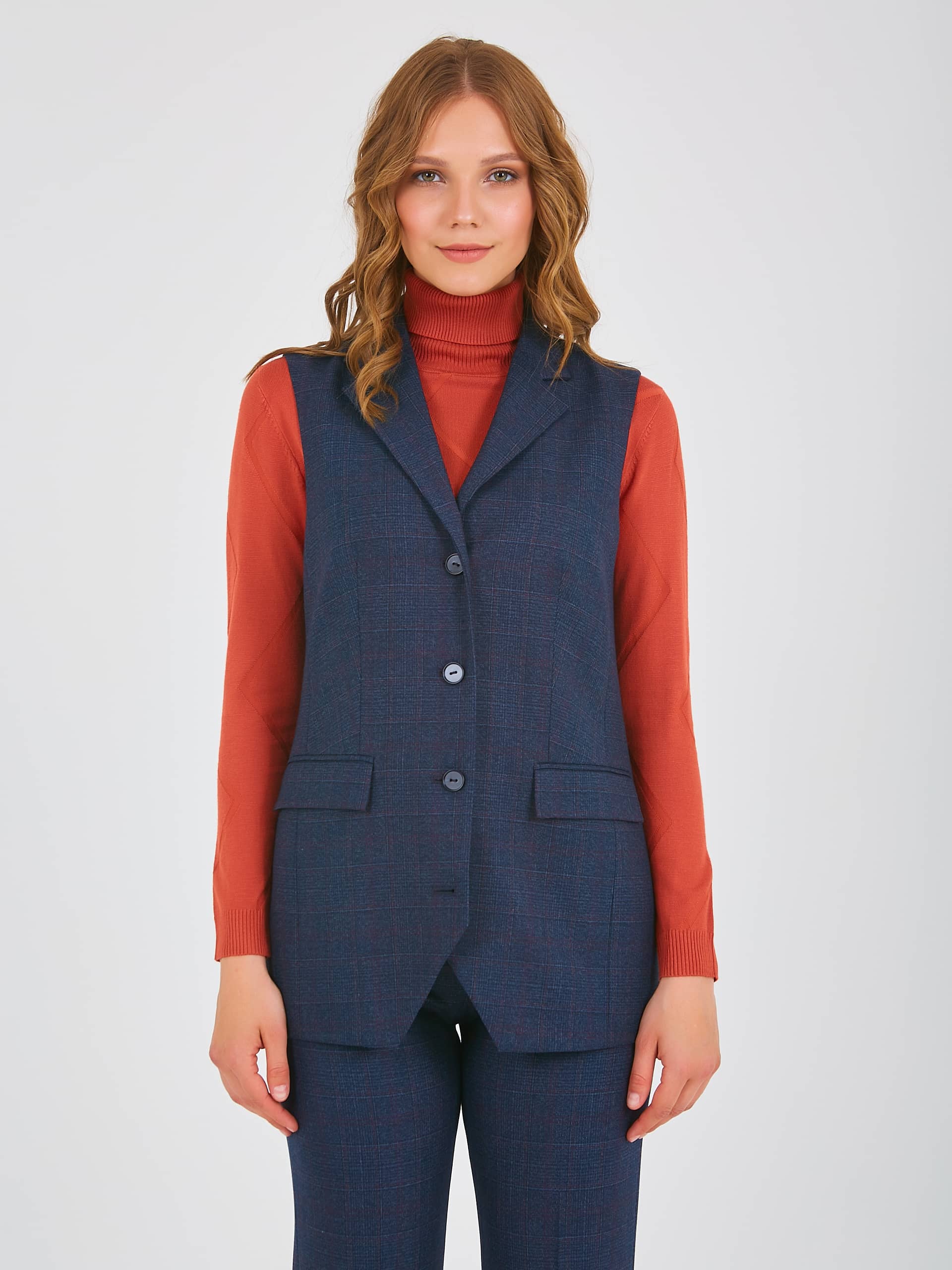 Жилет удлиненный прямого силуэта, с застежкой на четыре прорезные петли и пуговицы, дизайнерская особенность модели - принт в "клетку". Перед с вытачками для лучшей посадки по фигуре, также имеются прорезные карманы с клапанами. По спинке также имеются вытачки. Воротник пиджачного типа.