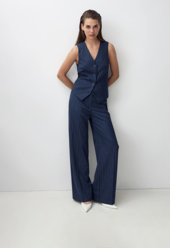 Прямой чуть приталенный жилет из костюмной ткани с добавлением вискозы в темно-синем цвете с тонкой вертикальной полосой белого цвета. Жилет с V-образным вырезом на пуговицах и декоративным элементом на спинке. В жилете имеются прорезные карманы с листочками. Идеально впишется в офисный образ с жакетом и брюками из этой же ткани. Стиль smart casual.