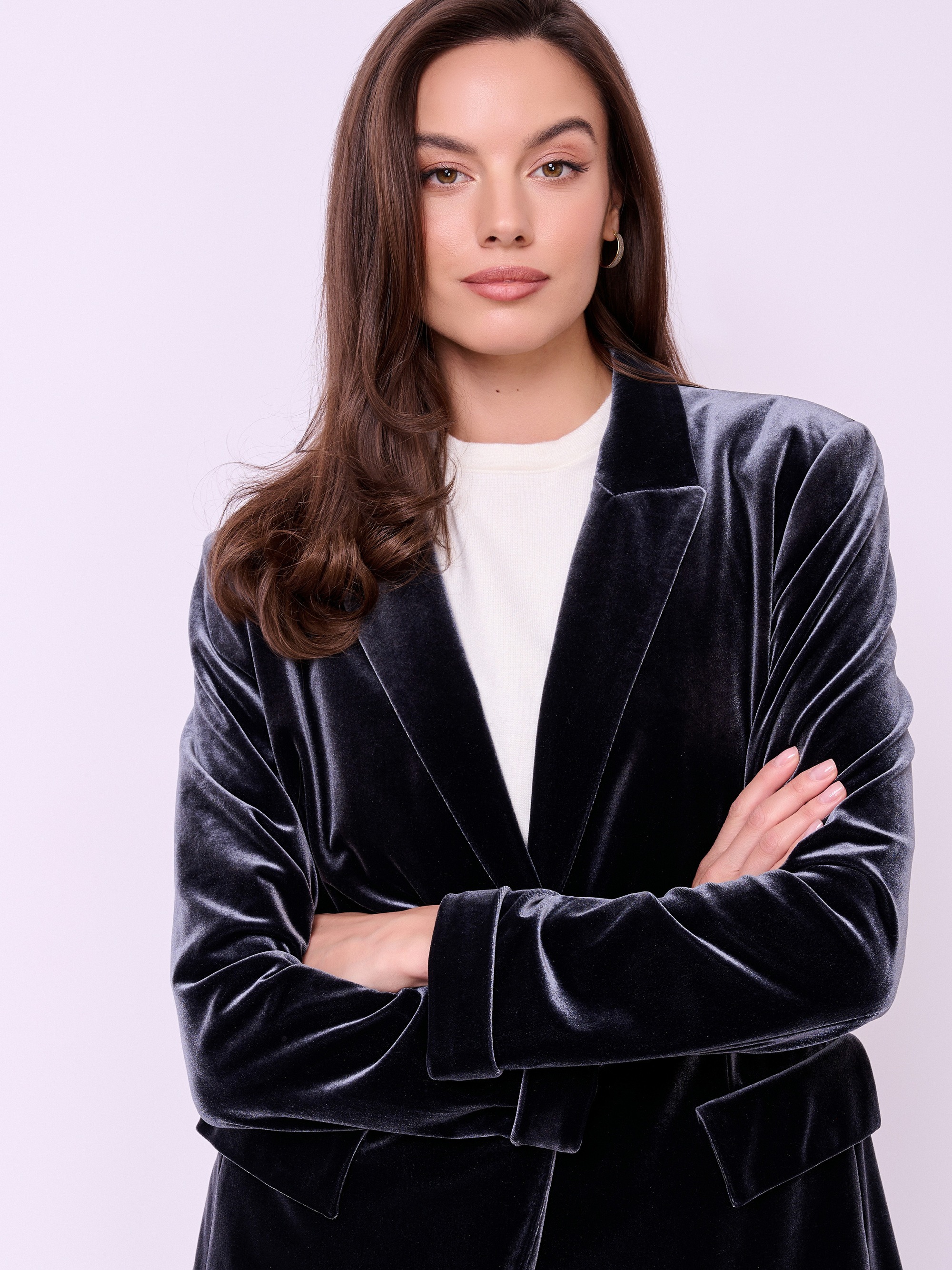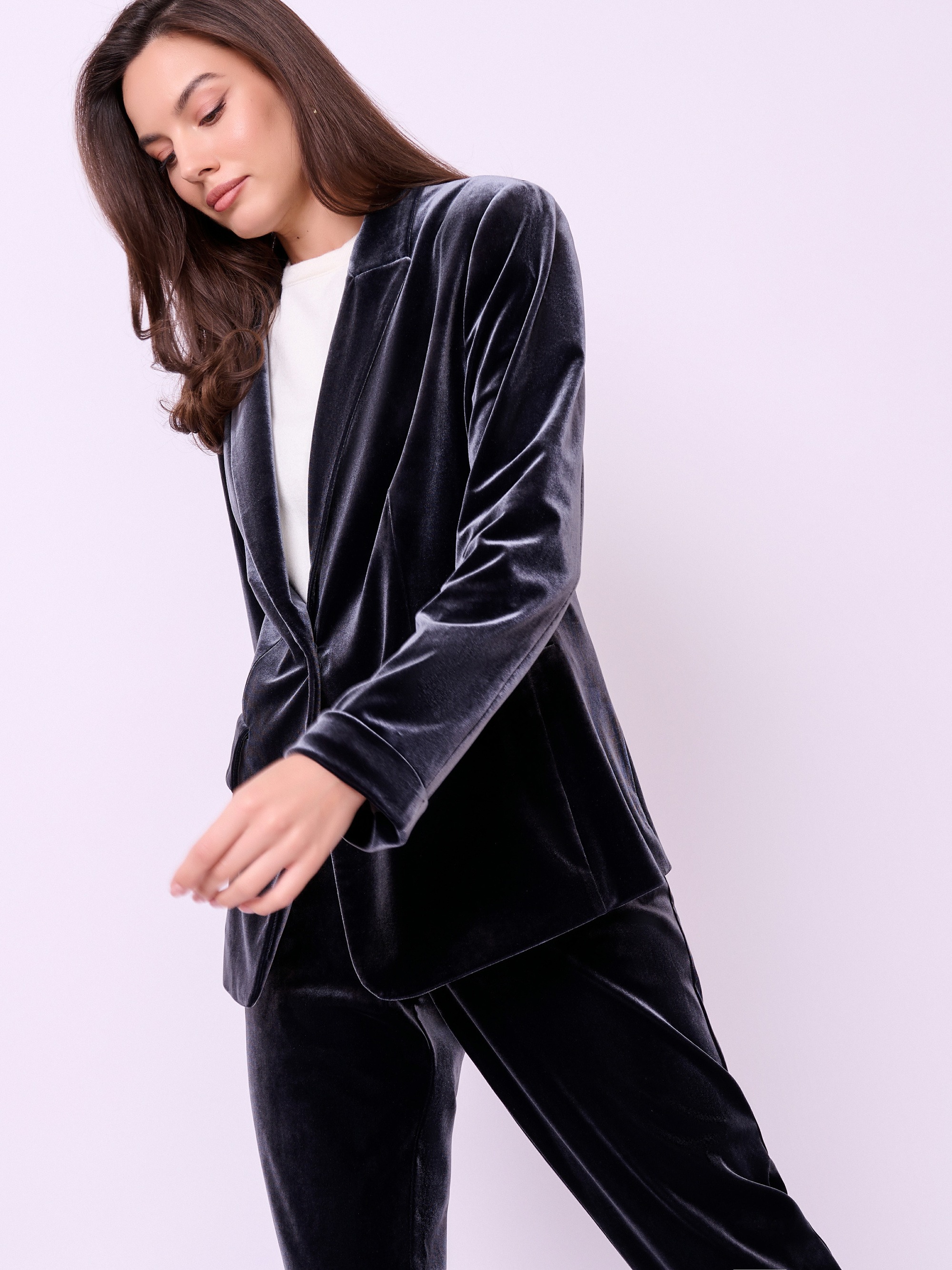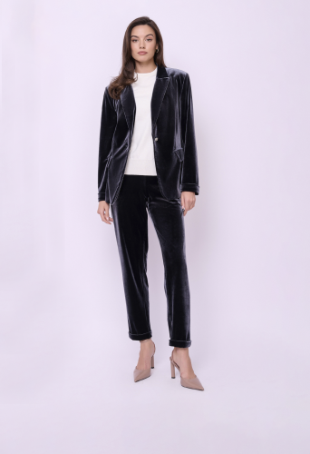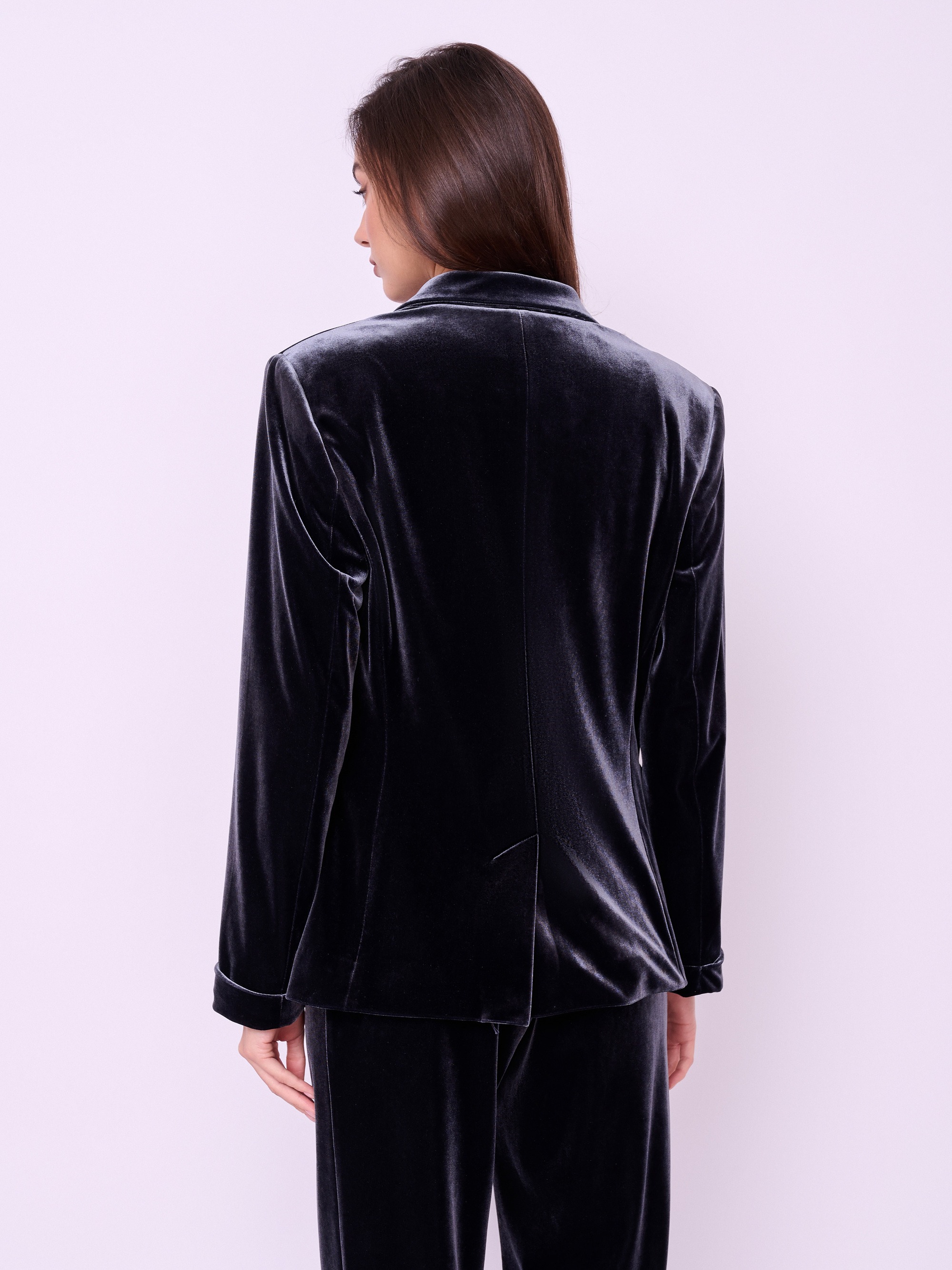 Однобортный жакет из трикотажного бархата полуприталенного покроя на пуговице с прорезными карманами и клапанами. Длина по спинке: 65 см.