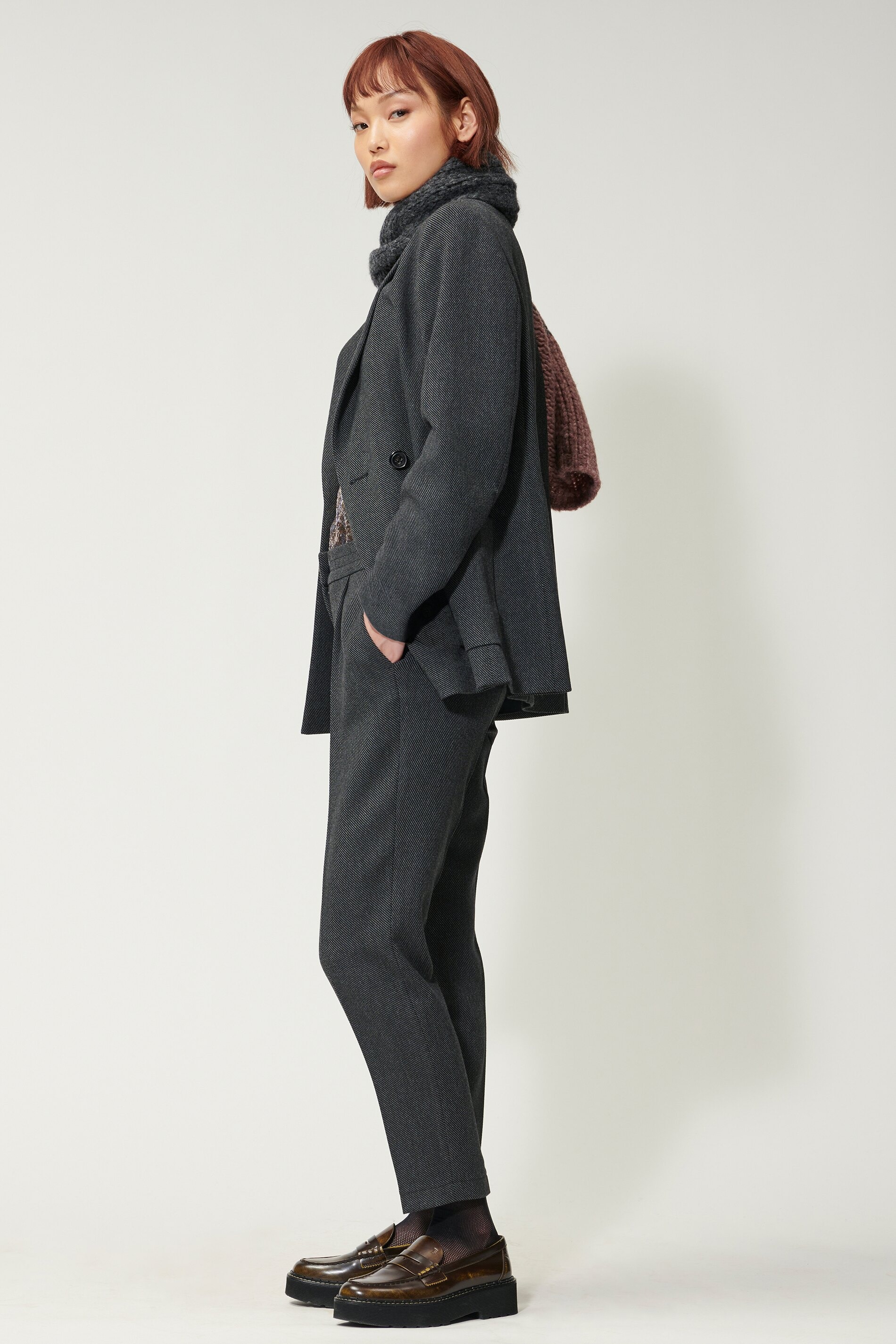 Длинный двубортный пиджак из тонкого габардина. Этот пиджак слегка приталенный и имеет два больших накладных кармана спереди.
