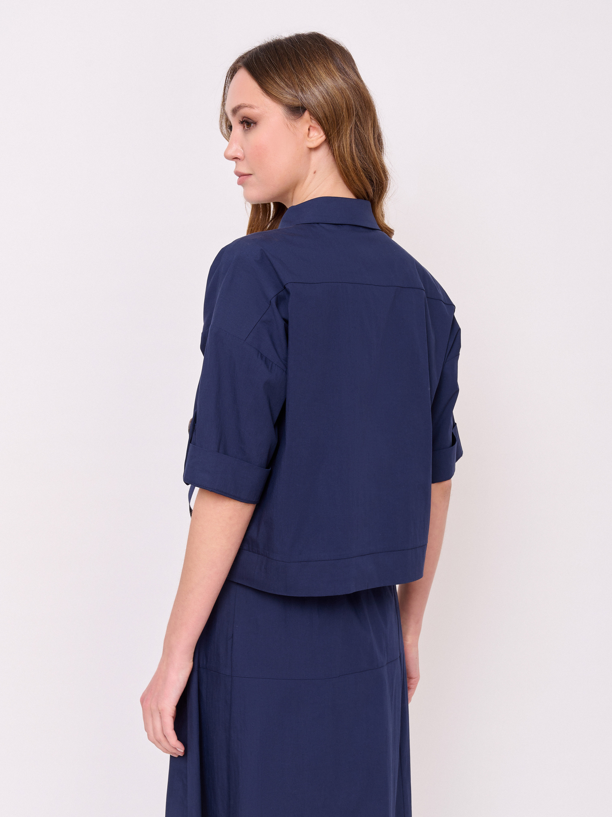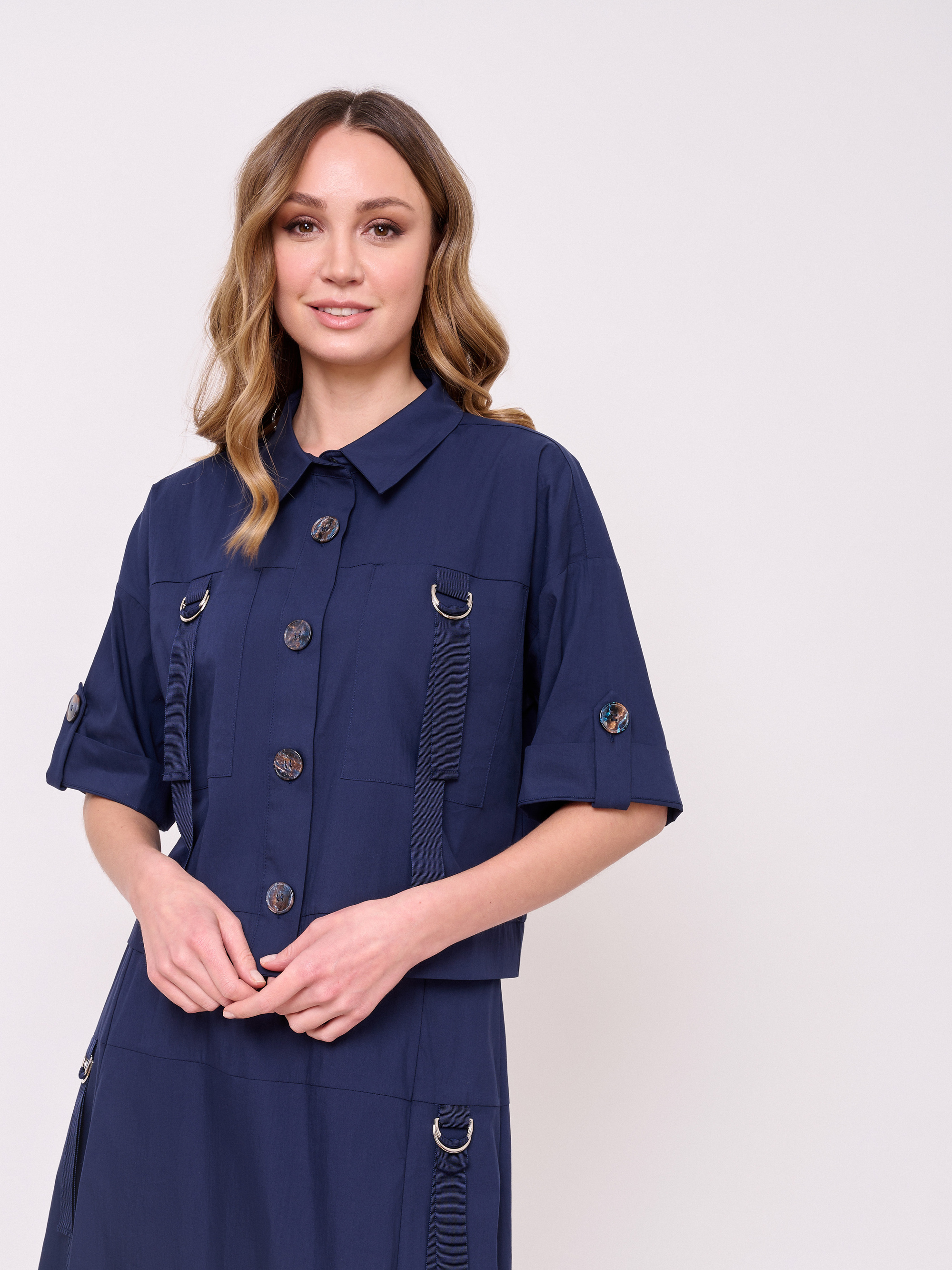 Укороченная блуза-жакет, застежка пуговицы, вырез горловины отложной воротничок, рукава короткие, карманы накладные, хлястики с металлическими пряжками. Длина по спинке: 51 см.