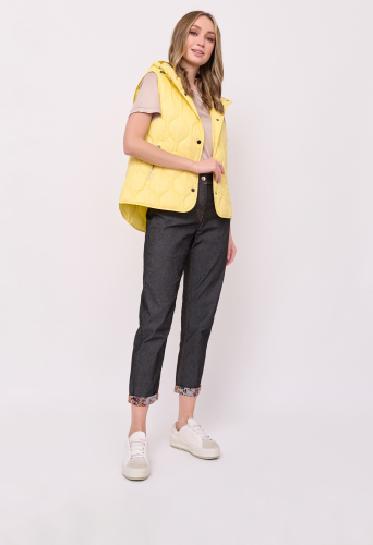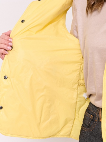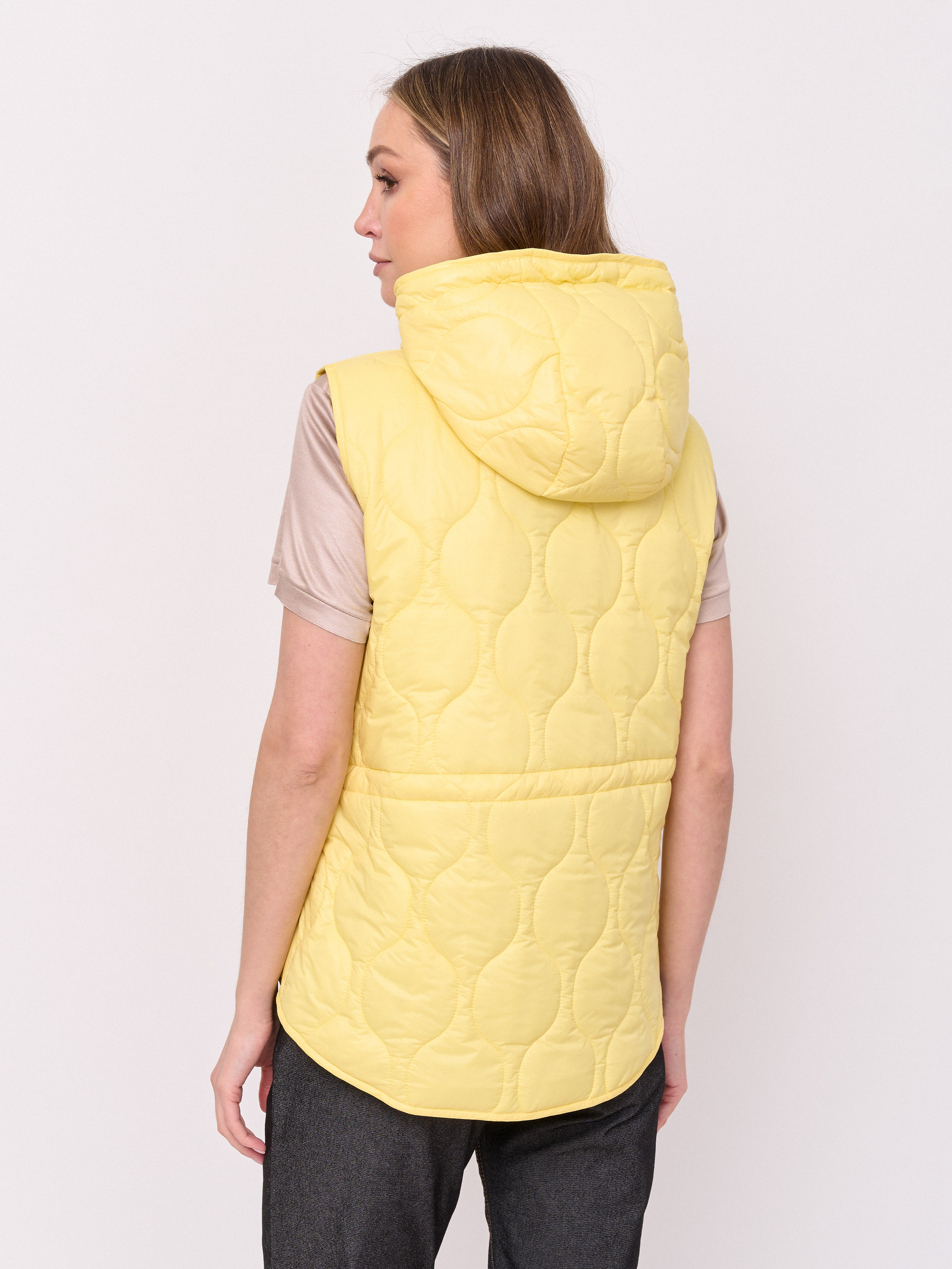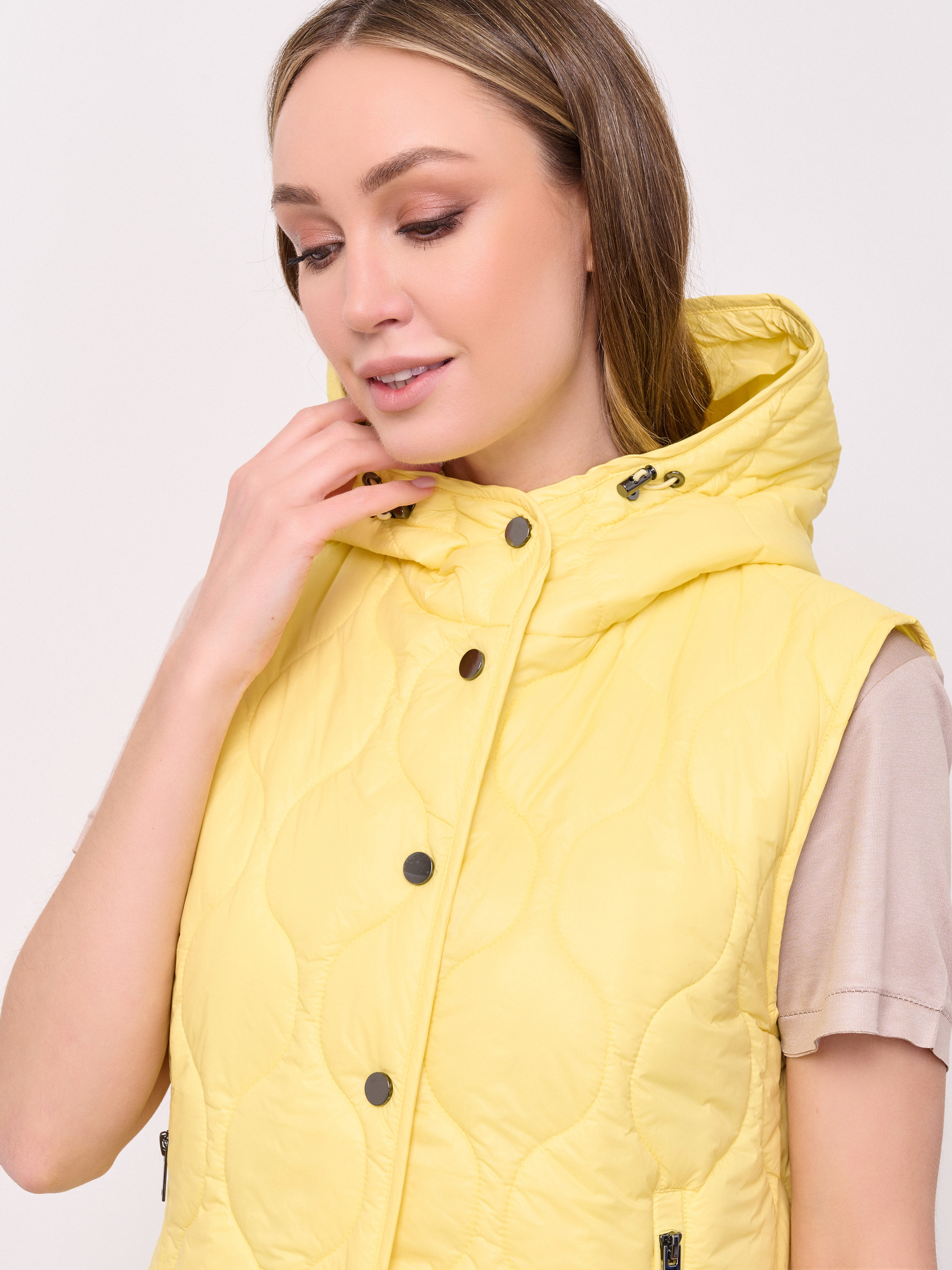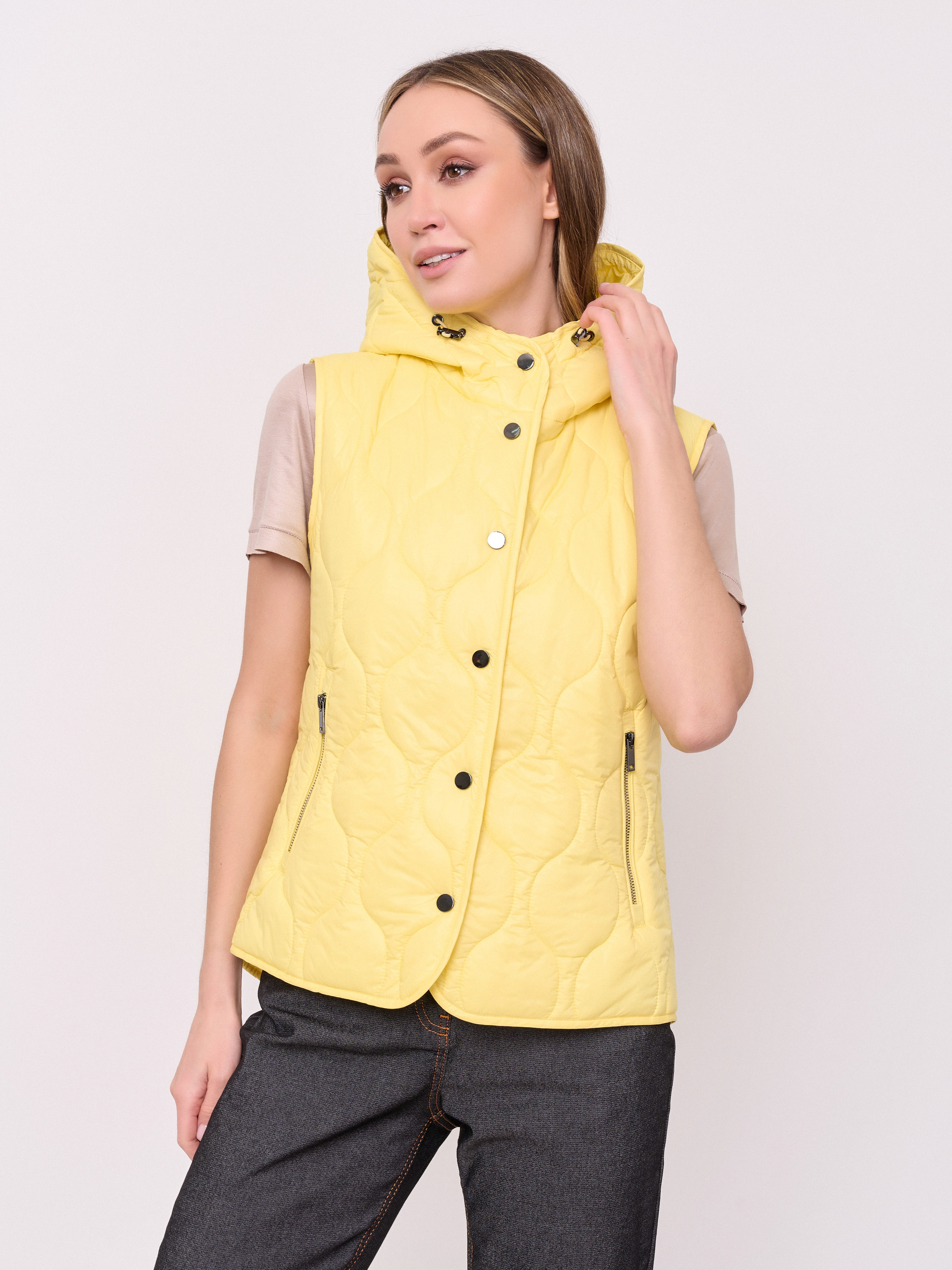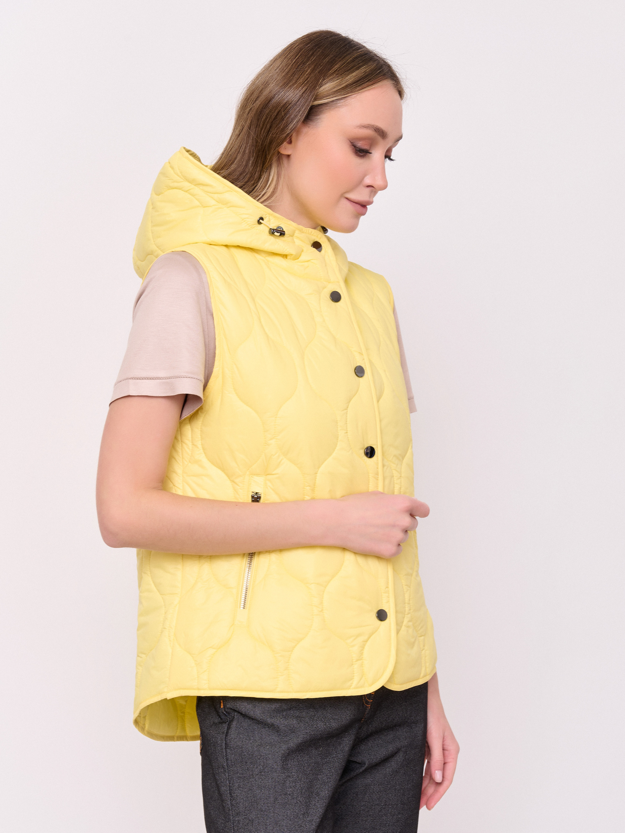Детали: застежка кнопки, с капюшоном, покрой полуприталенный, кулиска по линии талии на спинке, без рисунка, утеплитель полиэстер, карманы прорезные, модель жилета утепленный. Длина по спинке: 64 см. Плотность утеплителя: 80