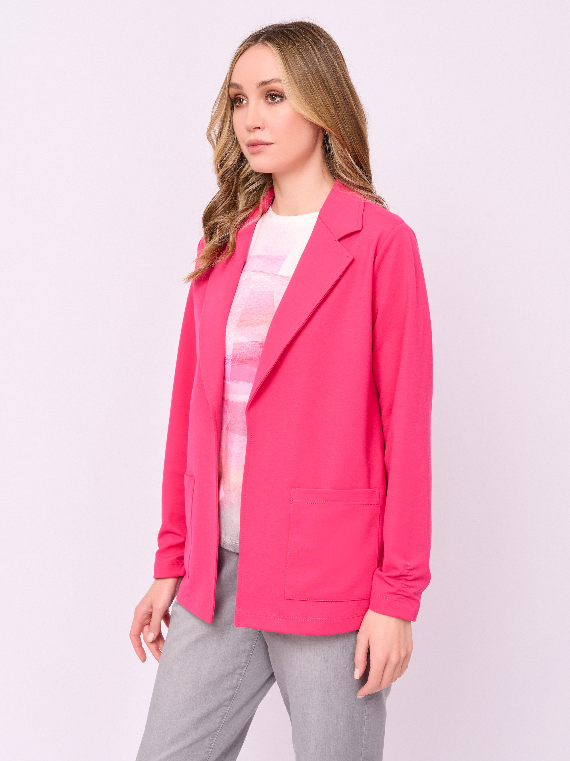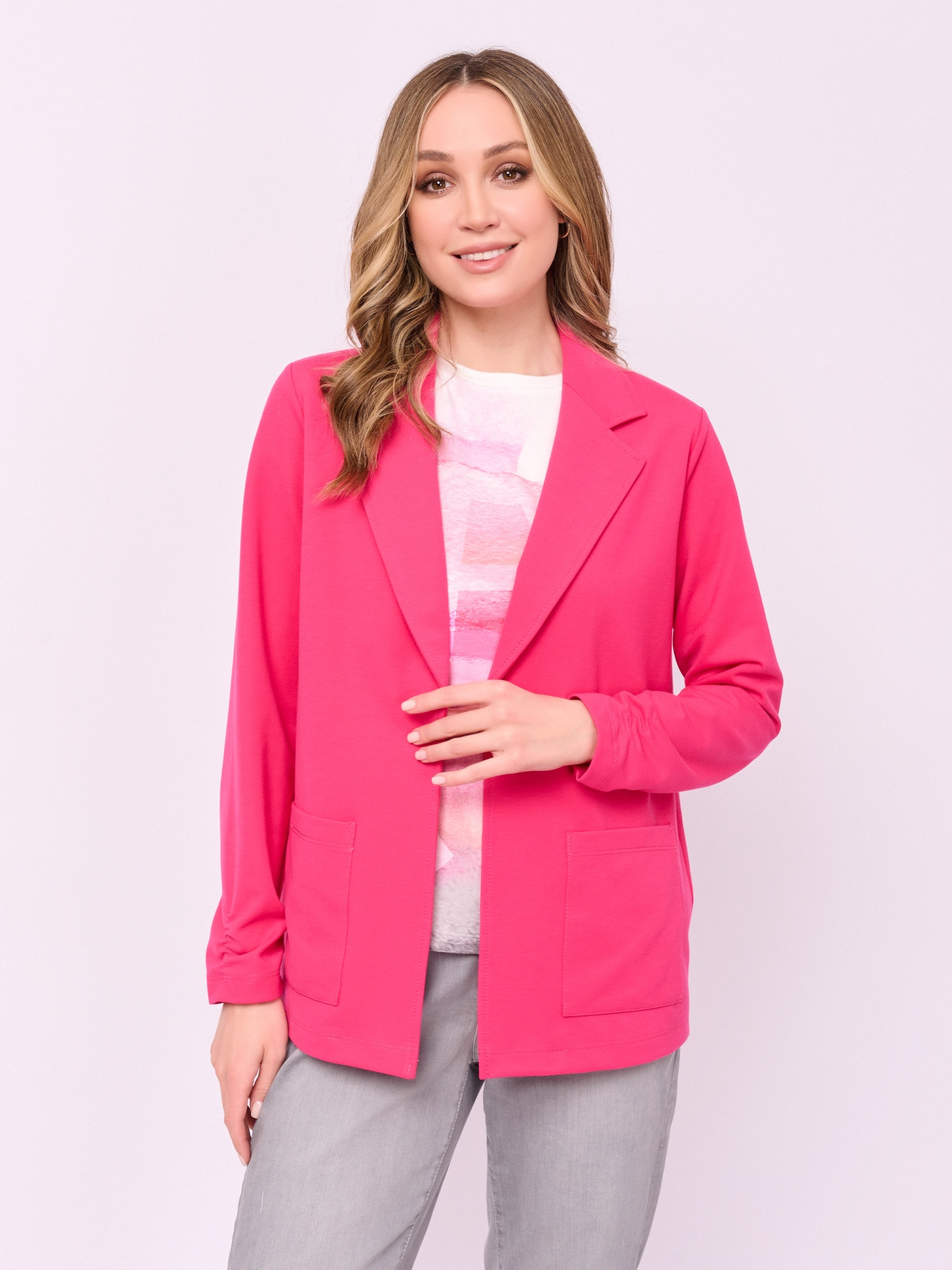 Детали: без застежки, вырез горловины английский воротник, рукава длинные, карманы накладные, присборенные рукава, прямой покрой. Длина по спинке: 66 см.