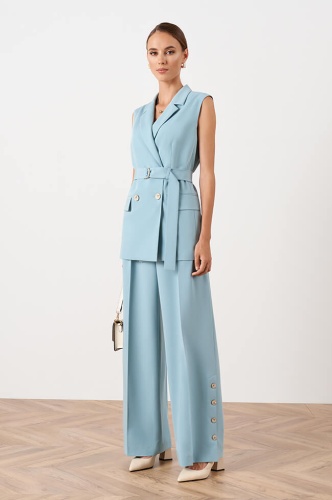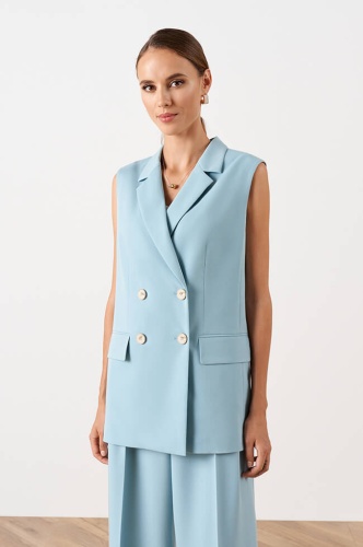 Удлиненный двубортный жилет прямого силуэта, выполнен из костюмного полотна. Отложной воротник с лацканами. Застежка на роговые пуговицы. Спереди имитация карманов с клапанами. Средний шов спинки заканчивается шлицей. Дополняется поясом из основного полотна с металлическими полукольцами. По обтачке выполнена дизайнерская вышивка «Флора».
