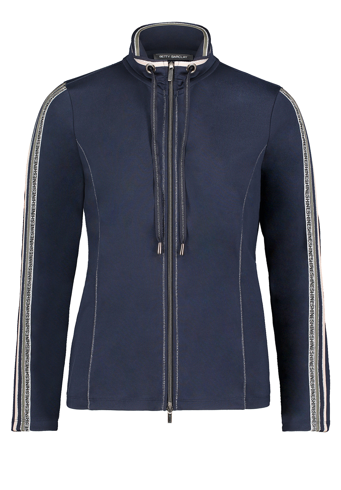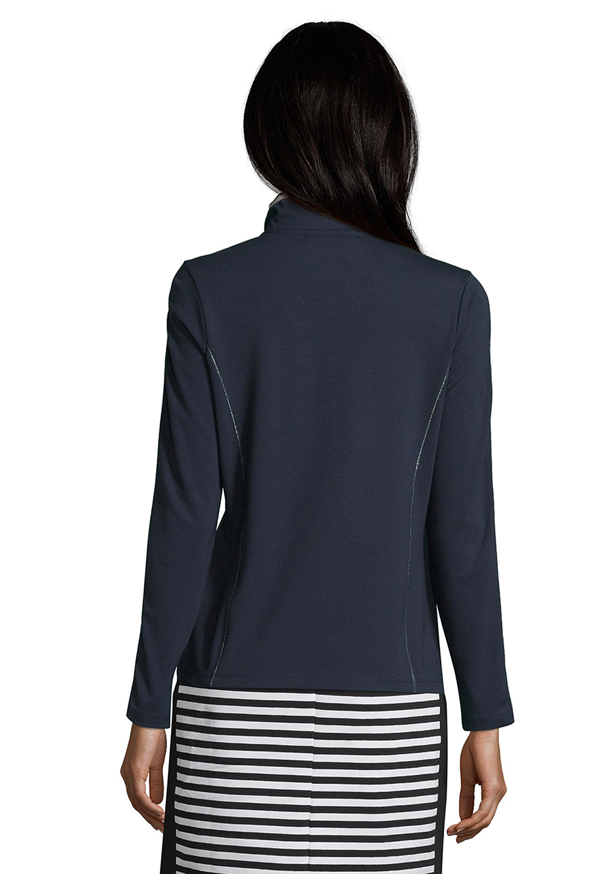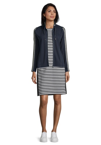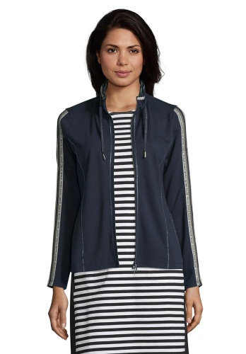 Блейзер в спортивном стиле - то, что нужно для городских прогулок. Полуприталенный силуэт, двойная застежка-молния, воротник-стойка, втачные рукава полной длины - вот что делает эту модель практичной и удобной в ношении. Отстрочка с нитью люрекса является модным акцентом и оттеняет спортивный стиль блейзера, а лампасы на рукавах вносят динамику в образ. Материал из вискозной смеси приятен к телу.