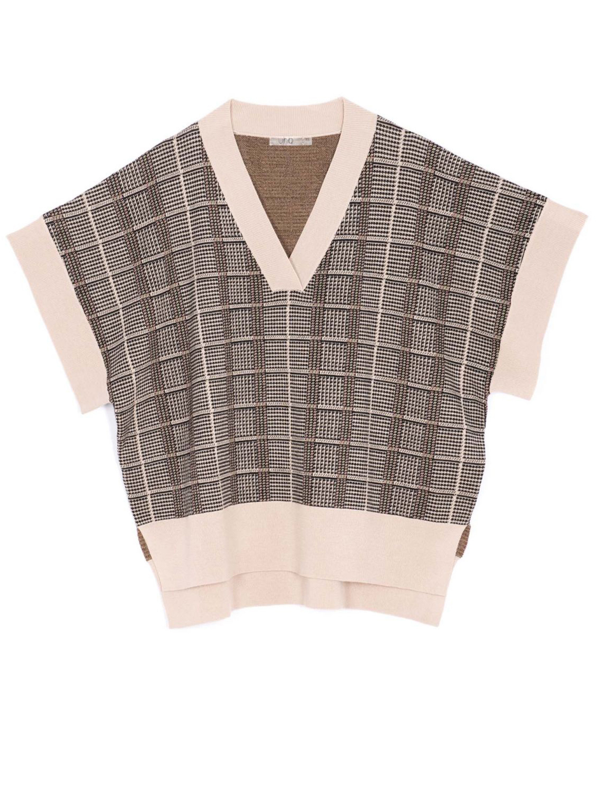 Оверсайз жилет в клетку с V- образным вырезом. Широкие контрастные манжеты в рубчик, спущенная линия плеч. Разрезы в боковых швах. Материал из смесовой шерсти приятен на ошупь и хорошо сохраняет тепло.