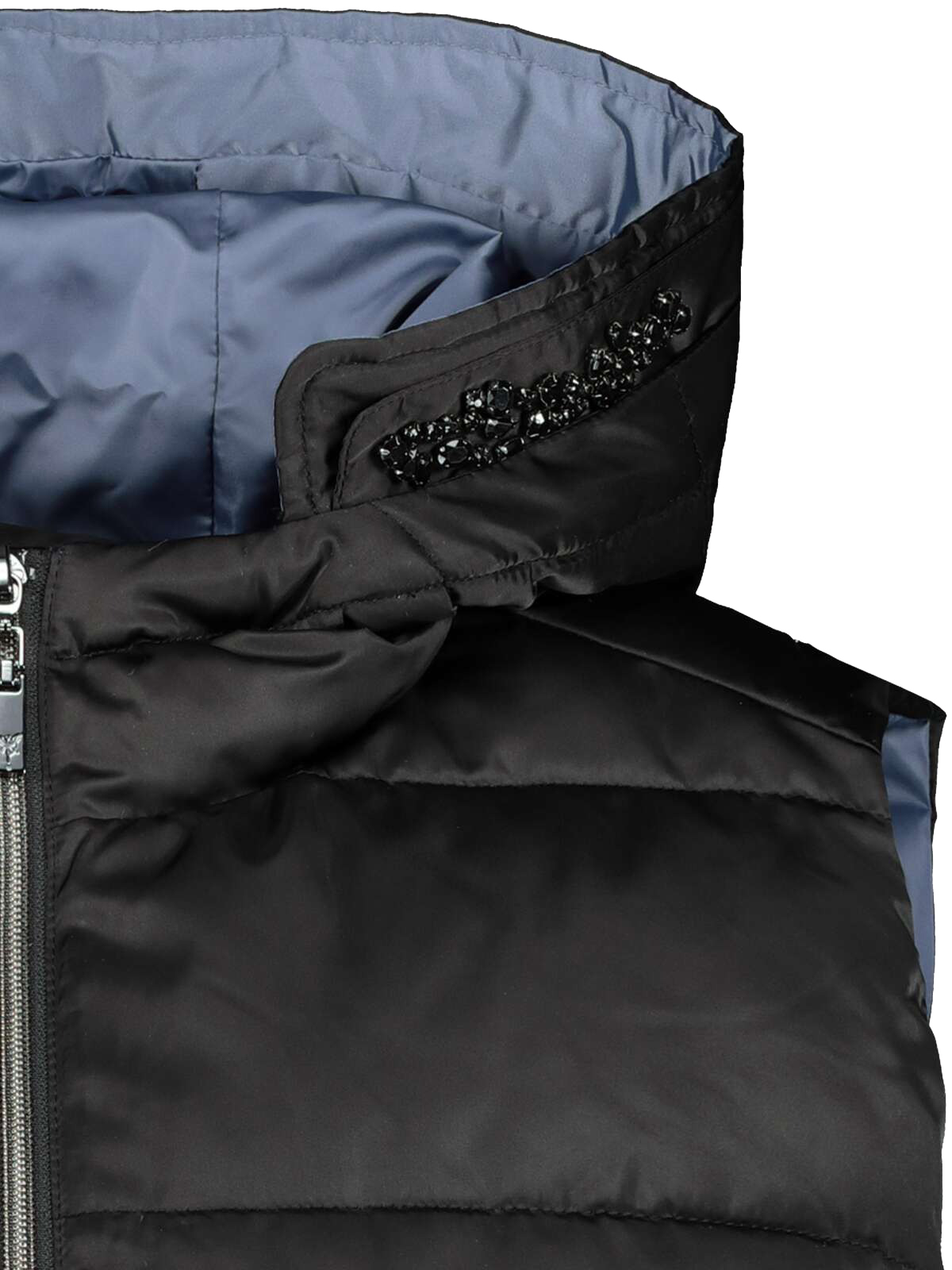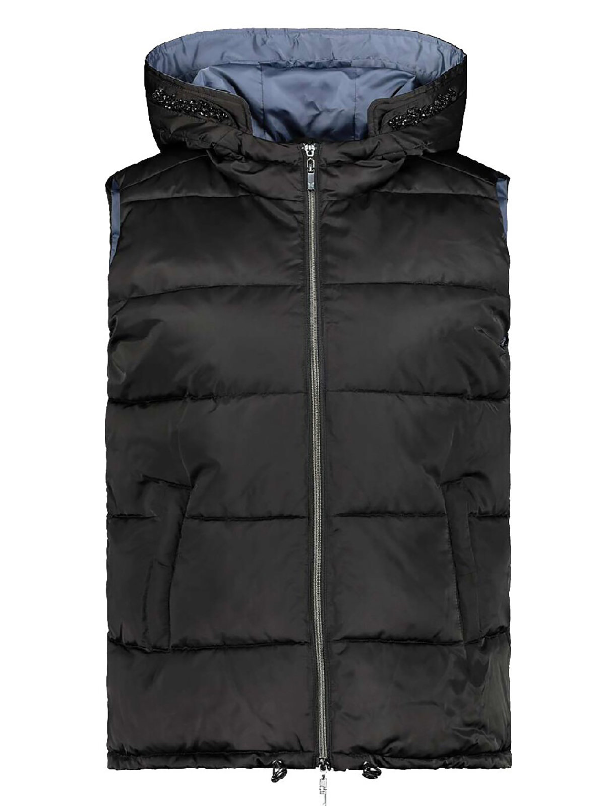Cтеганый жилет черного цвета – теплый и стильный элемент аутфита. Подойдет для образов в спортивном или повседневном стиле, а также для образов спорт-шик. Застежка на молнию и клепки. Объемный капюшон защищает от ветра.