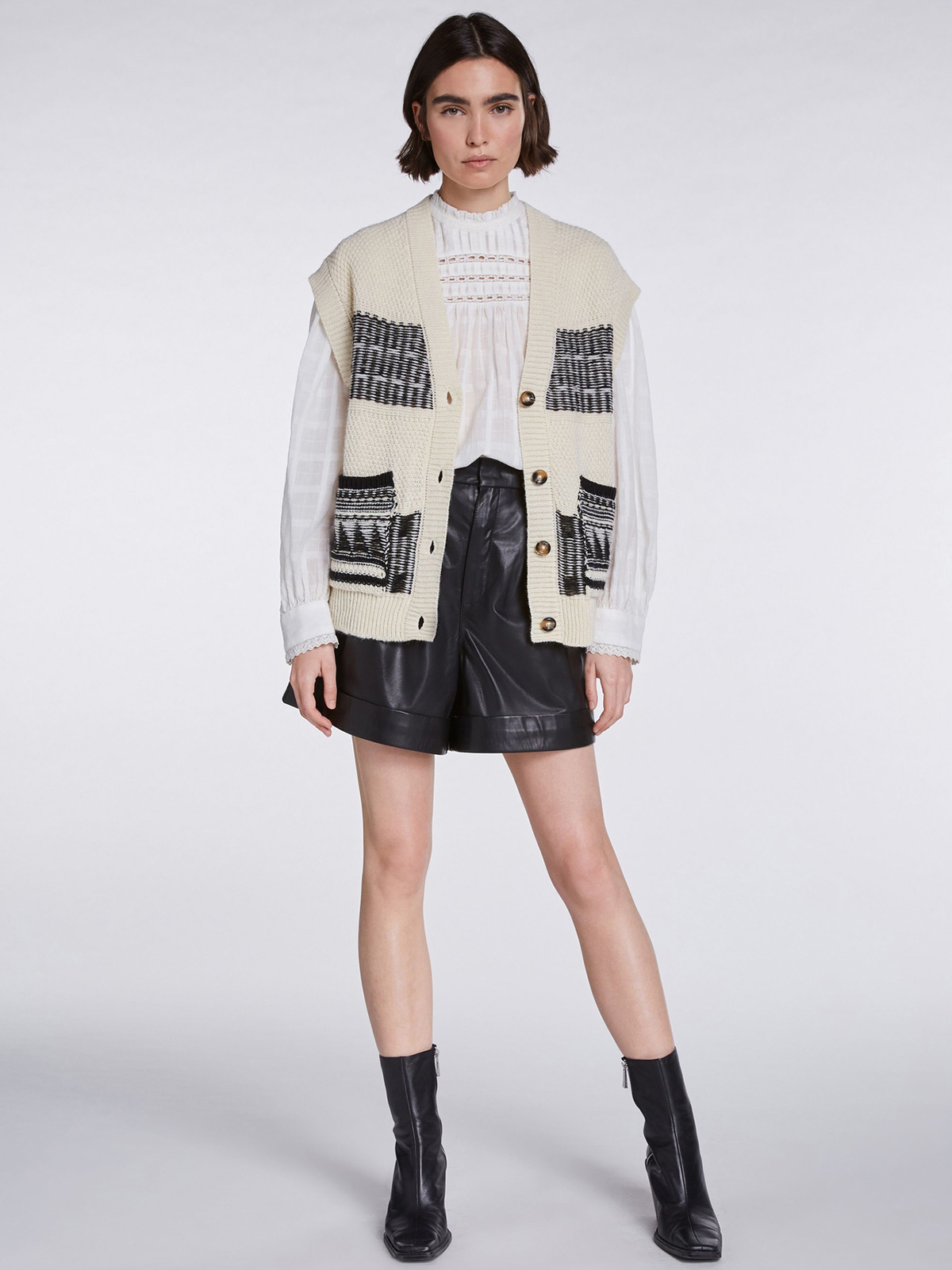 Жаккардовые жилеты – новый тренд, вошедший в моду осенью 2021. Материал из смесовой шерсти с добавлением шерсти альпаки. Накладные карманы спереди. Продуманный жаккардовый узор с лацканами. Женственный V-образный вырез с планкой на пуговицах. Длина для размера 42: 58 см.