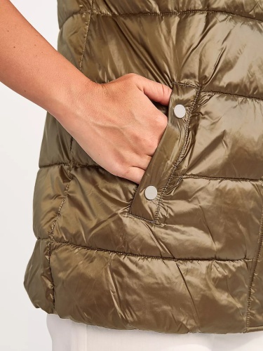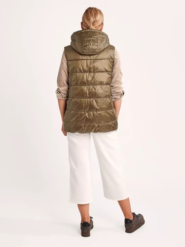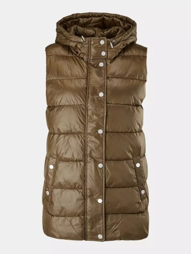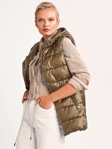 Стеганый жилет с синтепоном наполнителем. Объемный капюшон, застежка на молнию и планка с клепками, прорезные карманы с листочкой. Жилет прекрасно сохраняет тепло и дополняет образ в повседневном городском стиле.