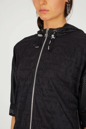 На сайте указаны Российские размеры. Жакет с короткими рукавами и капюшоном. Спереди имеются карманы. Молнии встроены в боковой шов, что позволяет варьировать ширину подола. Спину украшает благородный металлический переводной принт с логотипом Sportalm. Подол удлинен и слегка закруглен сзади.