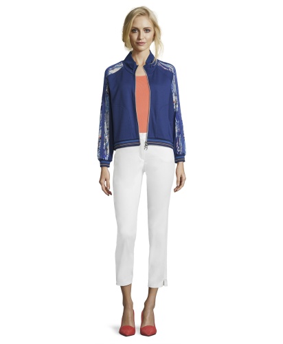 Блейзер в спортивном стиле выглядит очень модно и современно! Прямой покрой, воротник-стойка, застежка-молния, длинные рукава реглан. Трикотажная отделка манжет и низа изделия. Завершающая деталь дизайна - контрастные вставки вдоль рукавов. Материал из вискозной смеси приятен к телу и обеспечивает комфорт. Этот блейзер - прекрасный выбор для прогулки прохладным летним вечером.