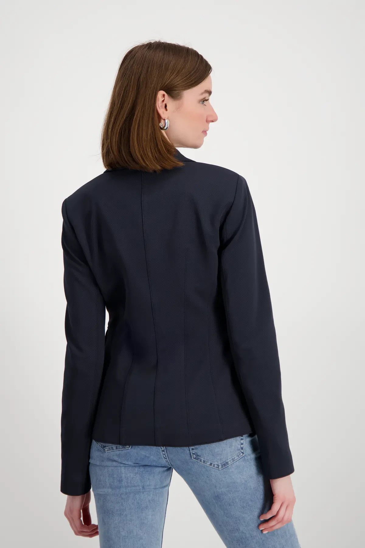 Жакет из эластичного материала с ребристой структурой, слегка приталенный. Воротник с лацканами. Ложный нагрудный карман и ложные карманы с клапанами. По центру планка с декоративными пуговицами.