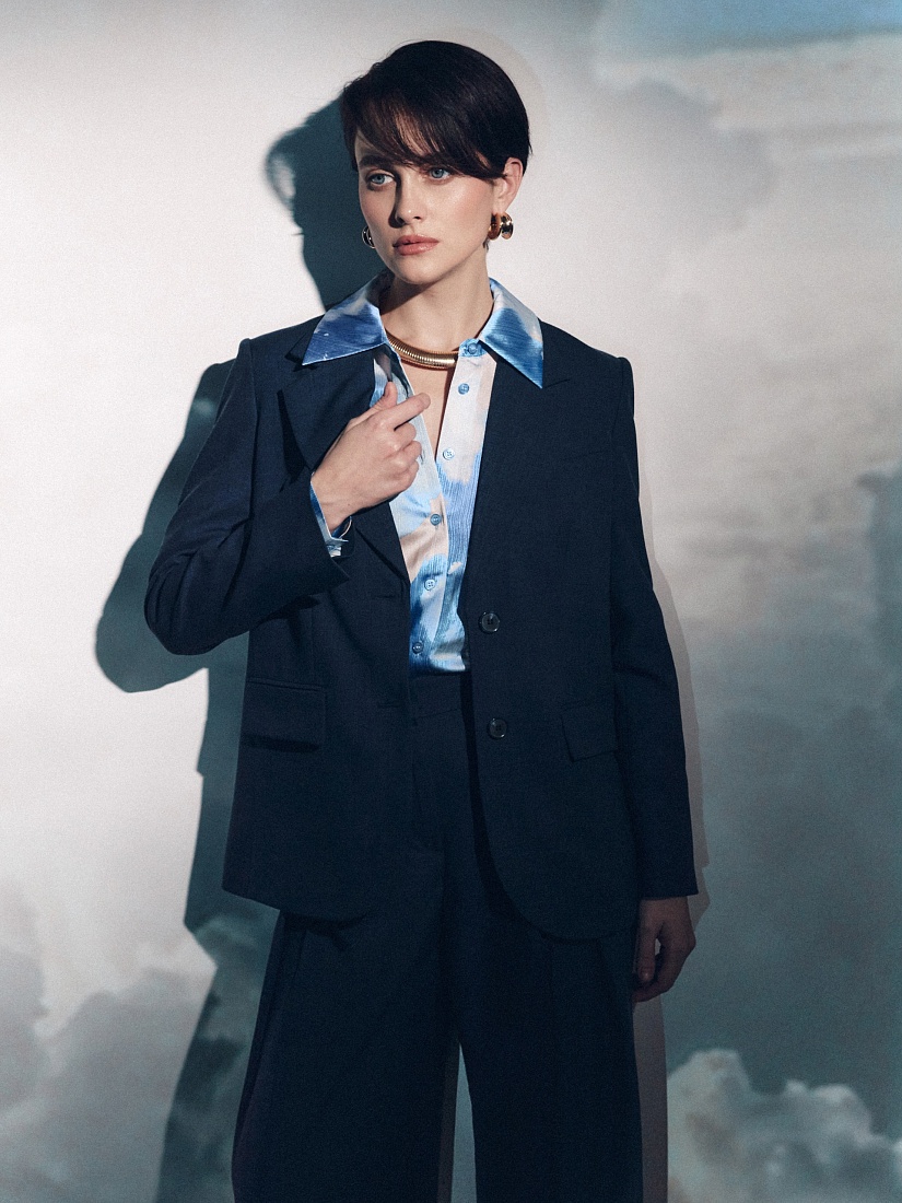 Удлиненный прямой однобортный жакет с V-образным вырезом и английским воротником. Жакет на двух пуговицах с прорезными карманами и клапанами, на спинке шлица.