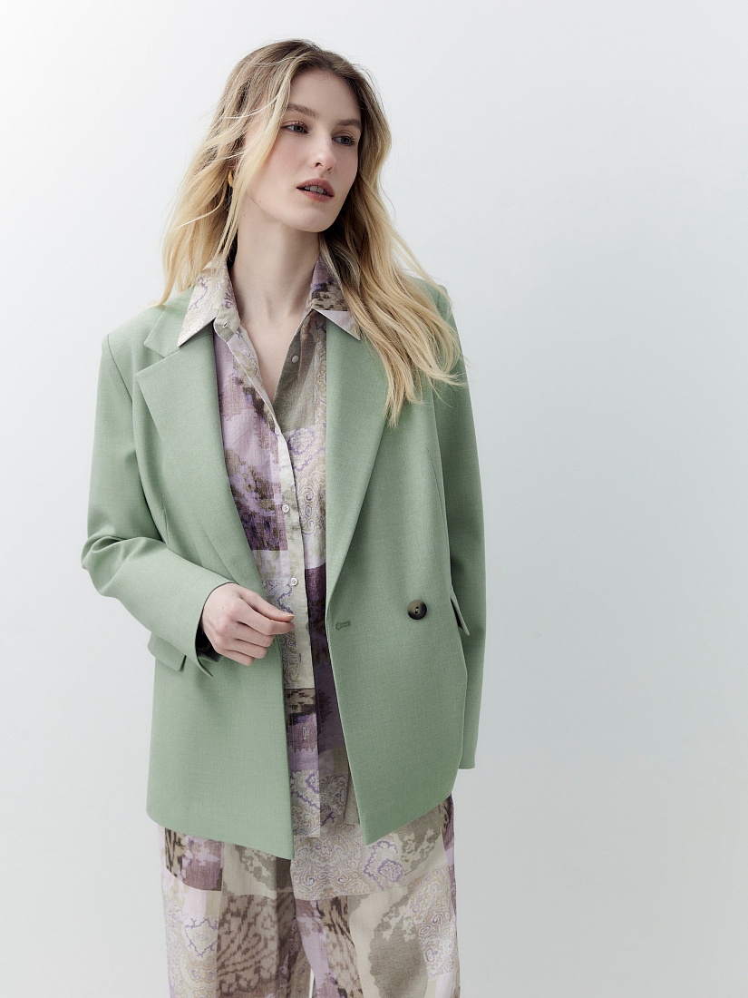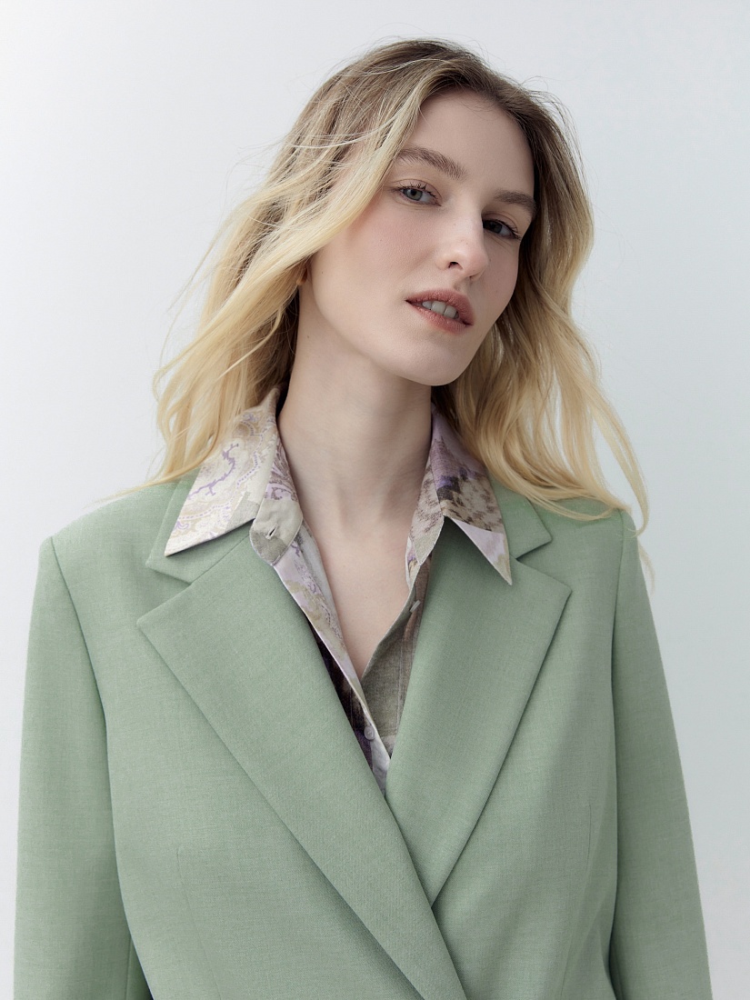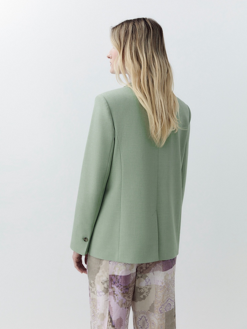 Однобортный жакет на подкладке со спущенной линией плеча и округлыми лацканами. Прорезные карманы с клапанами. Жакет выполнен из костюмной ткани в модном цвете "зеленая дымка". Жакет на подкладке.