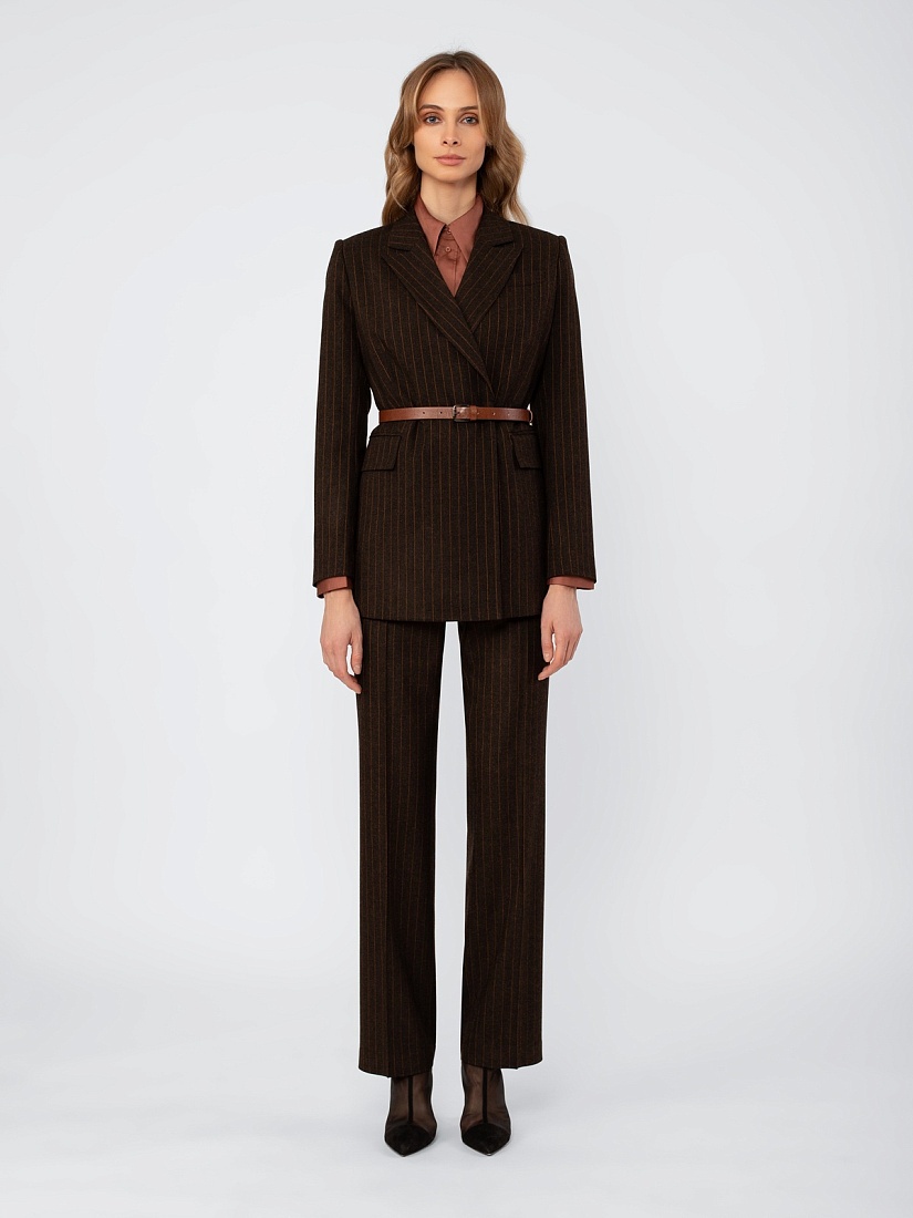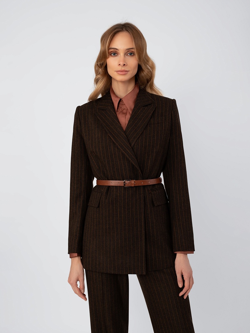 Жакет в стиле кэжуал, полуприлегающего силуэта, на подкладке. Застежка на пуговицы. Воротник английский. Рукав втачной. Карманы с клапаном. Ремень из экокожи с пряжкой.