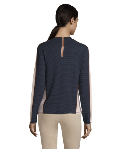 Стильный блейзер слегка приталенного силуэта. Круглый вырез горловины, длинные рукава, застежка-молния. Материал из вискозной смеси приятен к телу и обеспечивает комфорт. Сочетание контрастных цветов визуально делает силуэт более изящным. Этот блейзер - модный выбор для прогулки прохладным летним вечером.